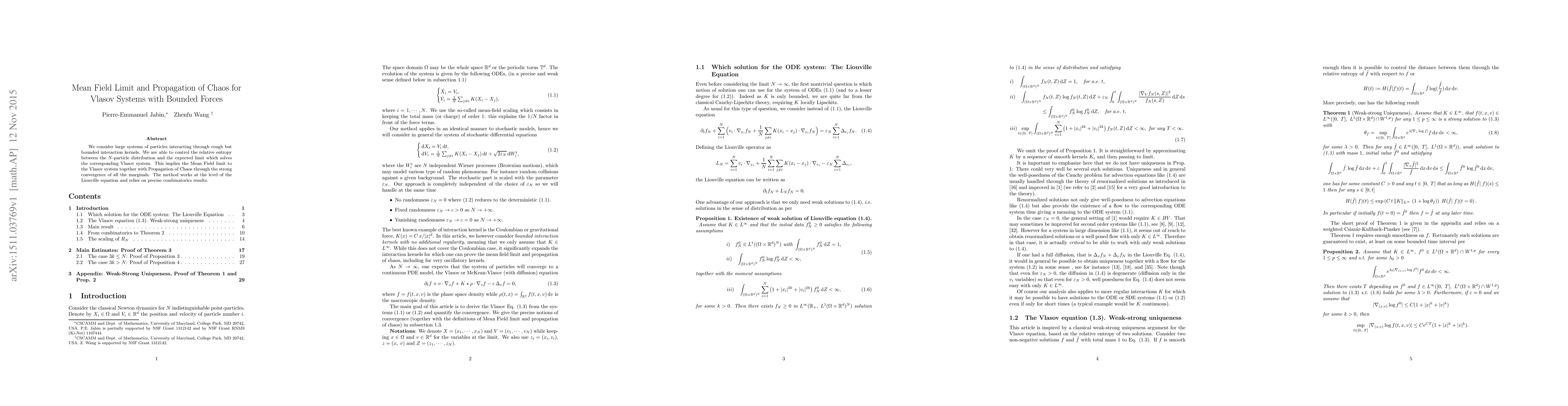 This paper establishes the Mean Field limit and Propagation of Chaos for Vlasov systems with bounded forces, demonstrating strong convergence of all marginals through control of relative entropy between particle distributions and the limit Vlasov solution, utilizing precise combinatorics.