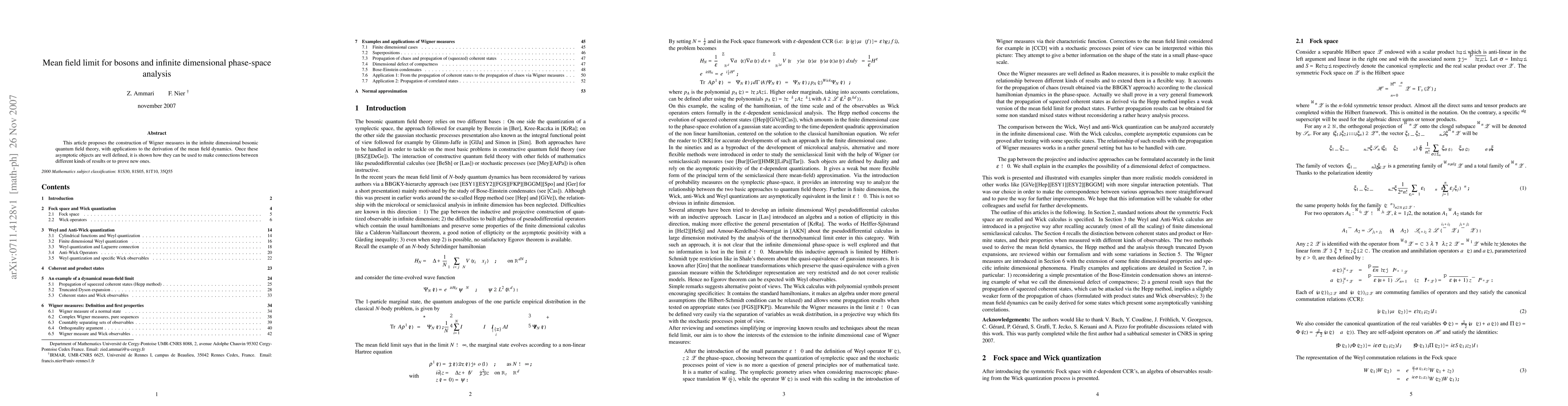 This paper constructs Wigner measures in infinite-dimensional bosonic quantum field theory to derive mean field dynamics, establishing connections between various results and proving new ones. The focus is on the mean field limit and its implications for infinite-dimensional phase-space analysis.