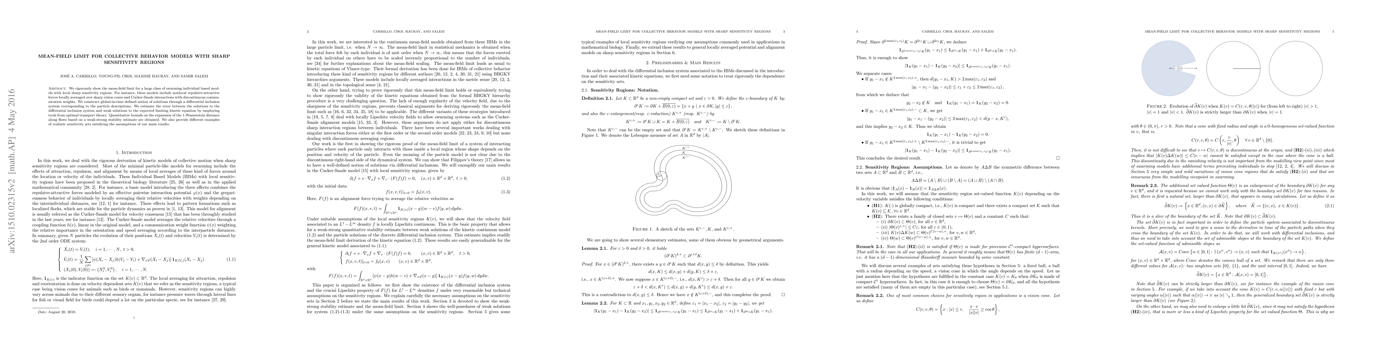 We rigorously show the mean-field limit for a large class of swarming individual based models with local sharp sensitivity regions. For instance, these models include nonlocal repulsive-attractive forces locally averaged over sharp vision cones and Cucker-Smale interactions with discontinuous communication weights. We construct global-in-time defined notion of solutions through a differential inclusion system corresponding to the particle descriptions. We estimate the error between the solutions to the differential inclusion system and weak solutions to the expected limiting kinetic equation by employing tools from optimal transport theory. Quantitative bounds on the expansion of the 1-Wasserstein distance along flows based on a weak-strong stability estimate are obtained. We also provide different examples of realistic sensitivity sets satisfying the assumptions of our main results.