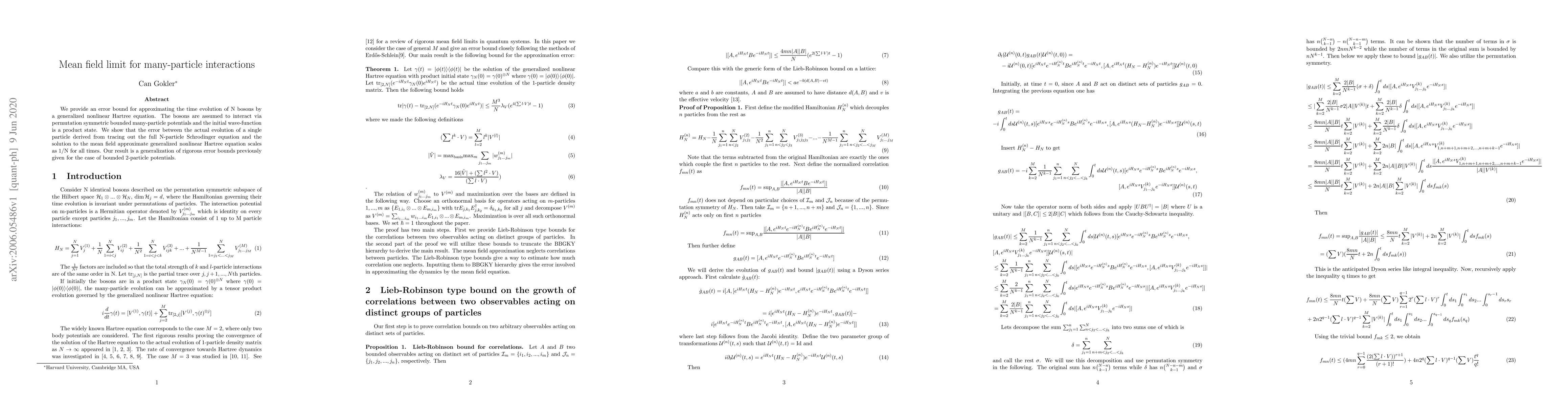 We provide an error bound for approximating the time evolution of N bosons by a generalized nonlinear Hartree equation. The bosons are assumed to interact via permutation symmetric bounded many-particle potentials and the initial wave-function is a product state. We show that the error between the actual evolution of a single particle derived from tracing out the full N-particle Schrodinger equation and the solution to the mean field approximate generalized nonlinear Hartree equation scales as 1/N for all times. Our result is a generalization of rigorous error bounds previously given for the case of bounded 2-particle potentials