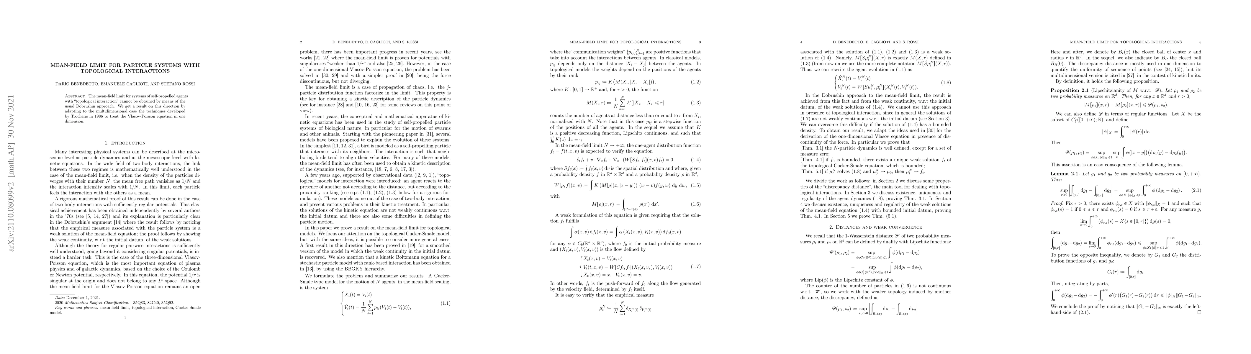 The mean-field limit for systems of self-propelled agents with topological interaction cannot be obtained by means of the usual Dobrushin approach. We get a result on this direction by adapting to the multidimensional case the techniques developed by Trocheris in 1986 to treat the Vlasov-Poisson equation in one dimension.