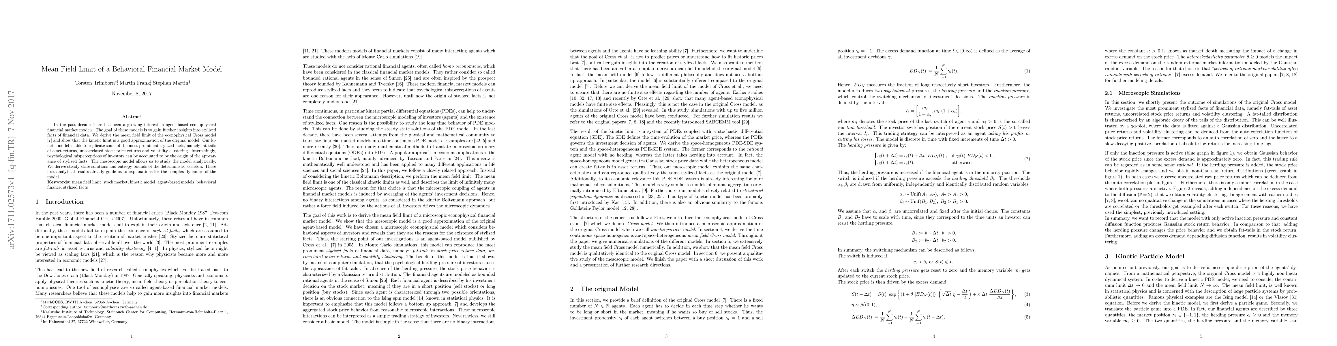 This paper derives the mean field limit of an agent-based financial market model, showing that a kinetic model closely approximates the original model. The kinetic model replicates key financial market phenomena, attributing stylized facts to psychological investor misperceptions.