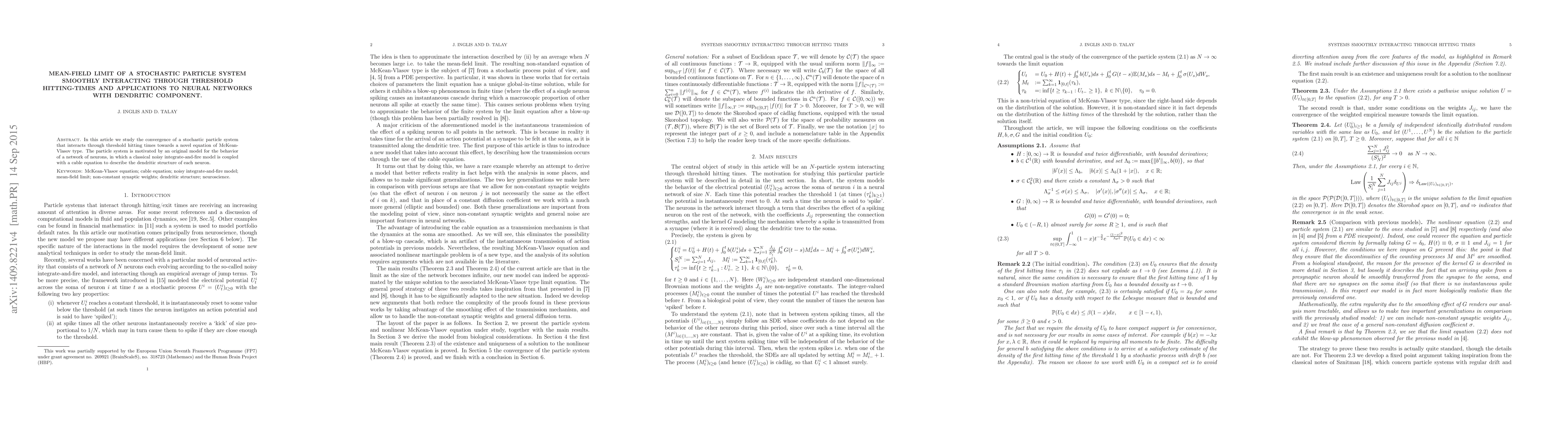 Summary: This paper investigates the convergence of a stochastic particle system interacting via threshold hitting times to a McKean-Vlasov equation, motivated by a neural network model combining integrate-and-fire dynamics with dendritic cable equations. The study provides insights into the behavior of neural networks with dendritic components.
