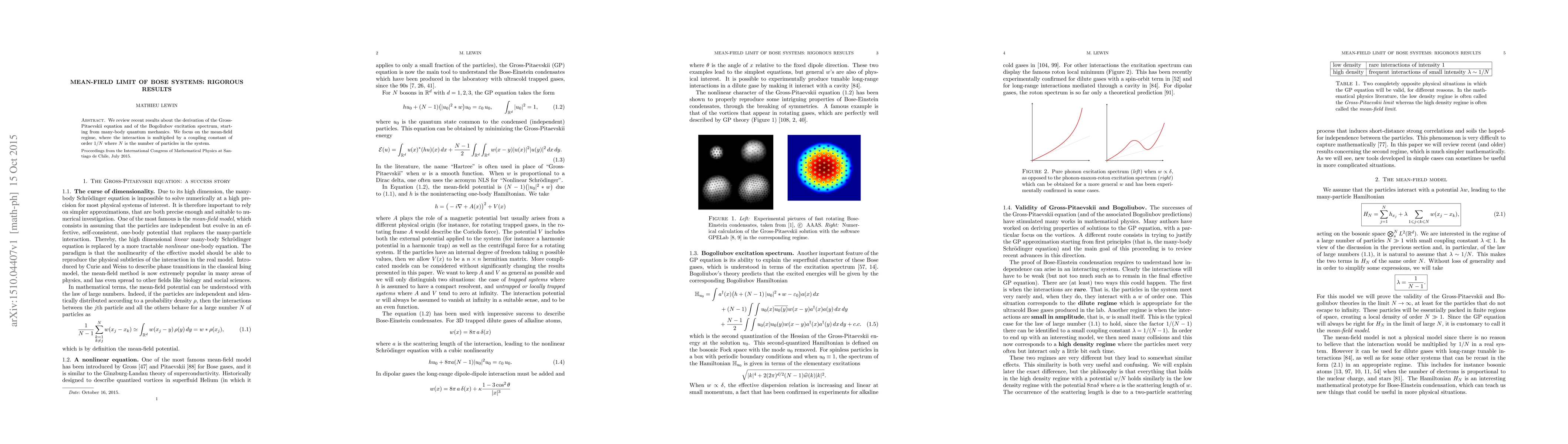 This paper reviews recent results on deriving the Gross-Pitaevskii equation and Bogoliubov excitation spectrum from many-body quantum mechanics in a mean-field regime for Bose systems, with implications for understanding condensate behavior.