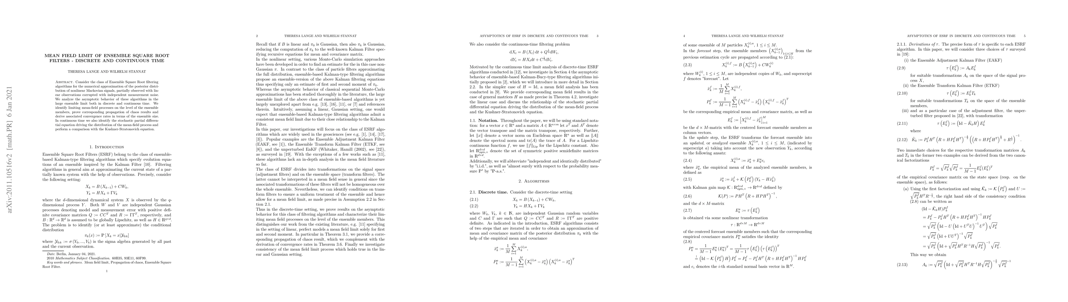 Consider the class of Ensemble Square Root filtering algorithms for the numerical approximation of the posterior distribution of nonlinear Markovian signals partially observed with linear observations corrupted with independent measurement noise. We analyze the asymptotic behavior of these algorithms in the large ensemble limit both in discrete and continuous time. We identify limiting mean-field processes on the level of the ensemble members, prove corresponding propagation of chaos results and derive associated convergence rates in terms of the ensemble size. In continuous time we also identify the stochastic partial differential equation driving the distribution of the mean-field process and perform a comparison with the Kushner-Stratonovich equation.