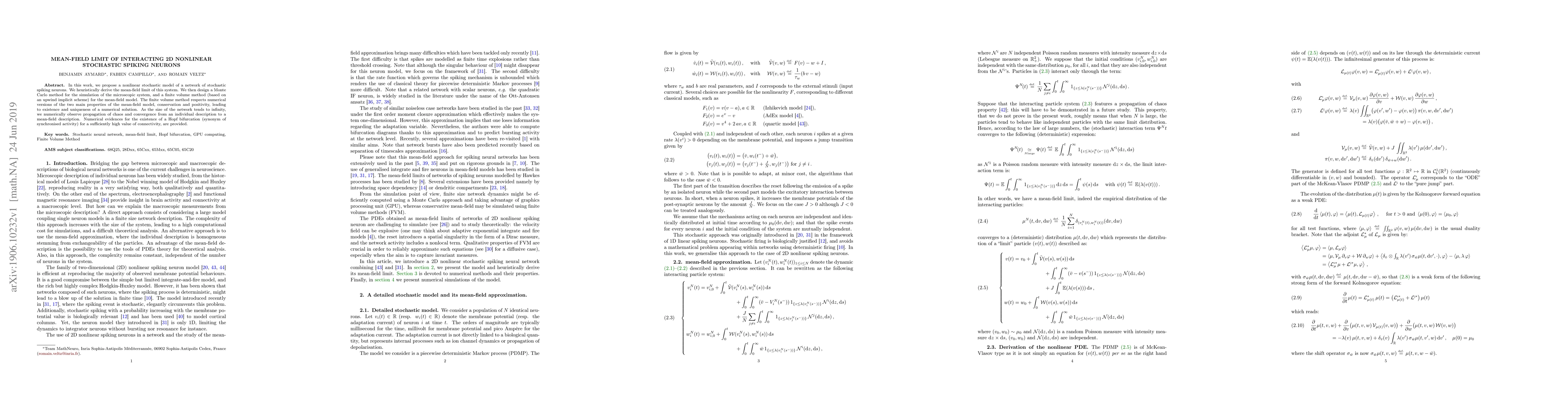 This paper develops a nonlinear stochastic model for a network of 2D spiking neurons and derives its mean-field limit. It employs Monte Carlo and finite volume methods to simulate the microscopic and mean-field models, respectively, demonstrating numerical convergence and the emergence of synchronized activity with increased connectivity.