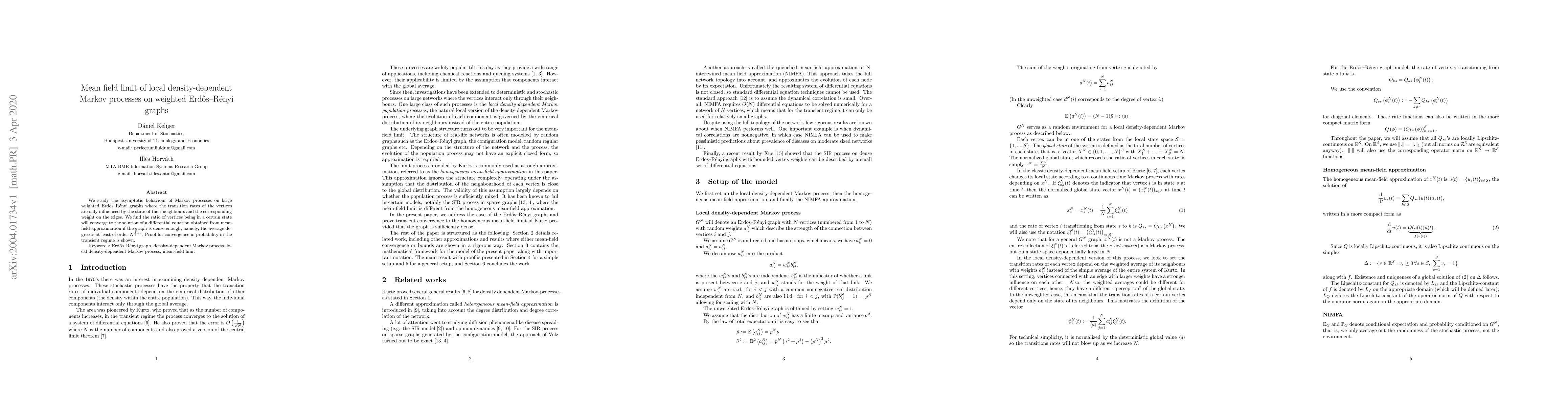 This research paper explores how Markov processes on large weighted Erdos-Renyi graphs behave as their size increases. It finds that the ratio of vertices in a certain state converges to a solution of a differential equation under certain density conditions.