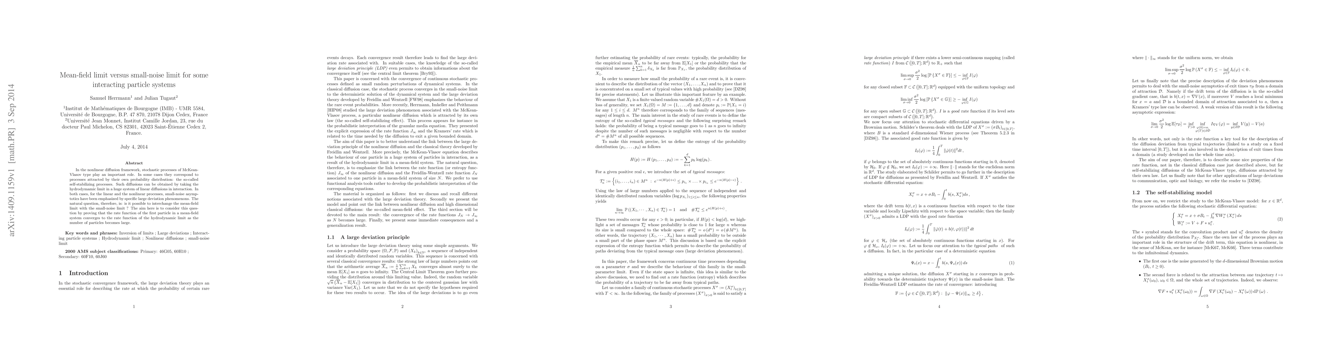 In the nonlinear diffusion framework, stochastic processes of McKean-Vlasov type play an important role. In some cases they correspond to processes attracted by their own probability distribution: the so-called self-stabilizing processes. Such diffusions can be obtained by taking the hydrodymamic limit in a huge system of linear diffusions in interaction. In both cases, for the linear and the nonlinear processes, small-noise asymptotics have been emphasized by specific large deviation phenomenons. The natural question, therefore, is: is it possible to interchange the mean-field limit with the small-noise limit? The aim here is to consider this question by proving that the rate function of the first particle in a mean-field system converges to the rate function of the hydrodynamic limit as the number of particles becomes large.