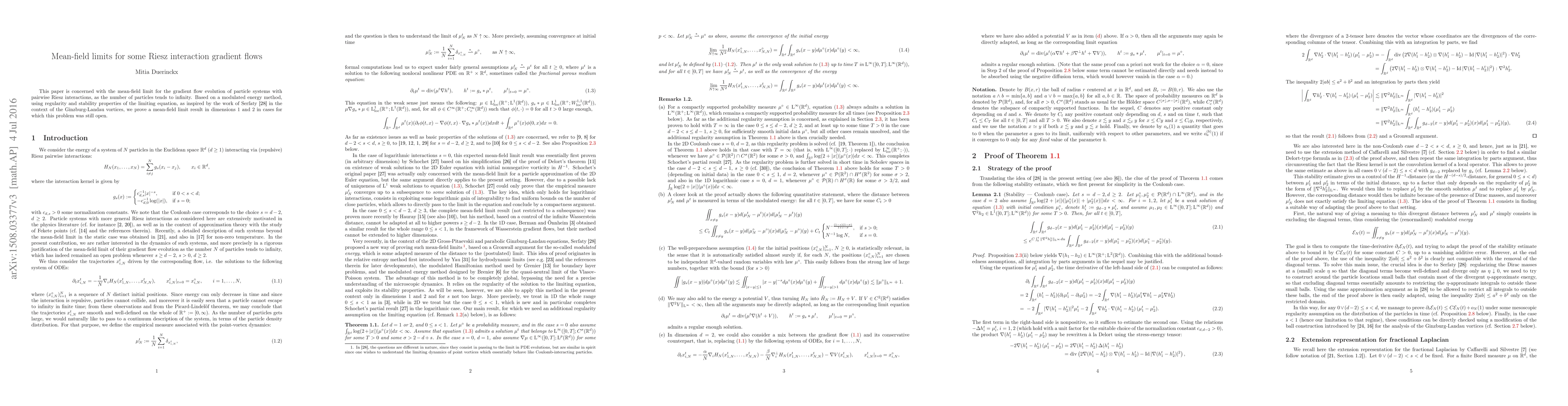 This paper proves mean-field limit results for gradient flow evolution of particle systems with Riesz interactions, demonstrating the convergence to a limiting equation in dimensions 1 and 2, using a modulated energy method inspired by Serfaty's work on Ginzburg-Landau vortices. This resolves previously open problems in these dimensions.