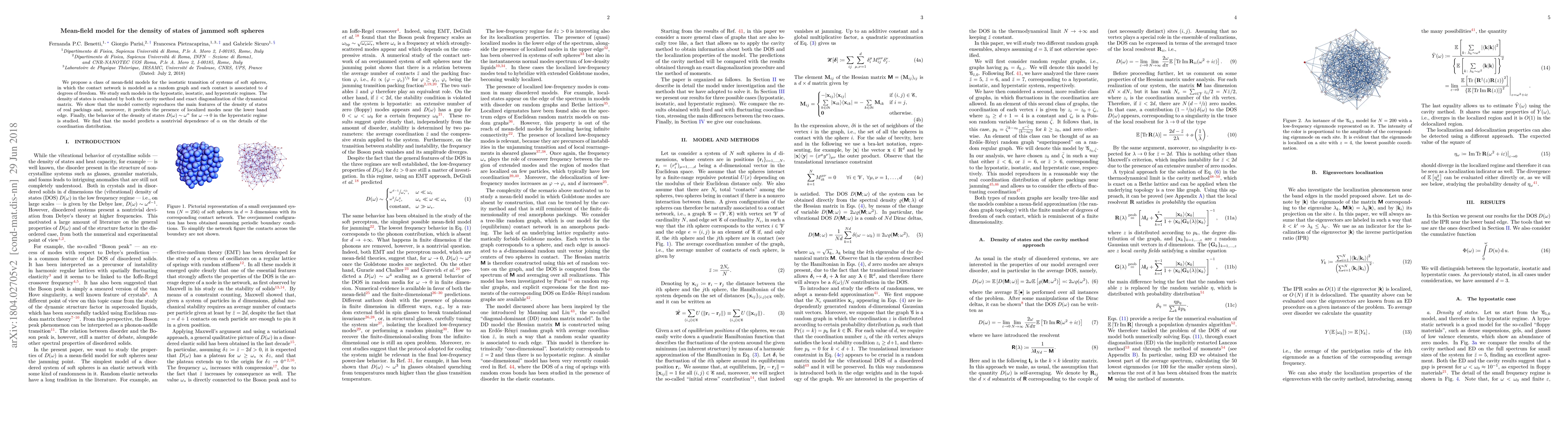 This paper proposes mean-field models for soft sphere systems, analyzing the density of states across different contact network regimes. The model accurately reproduces features of real packings and predicts localized modes, with a density of states scaling as $\omega^\alpha$ in the hyperstatic regime.