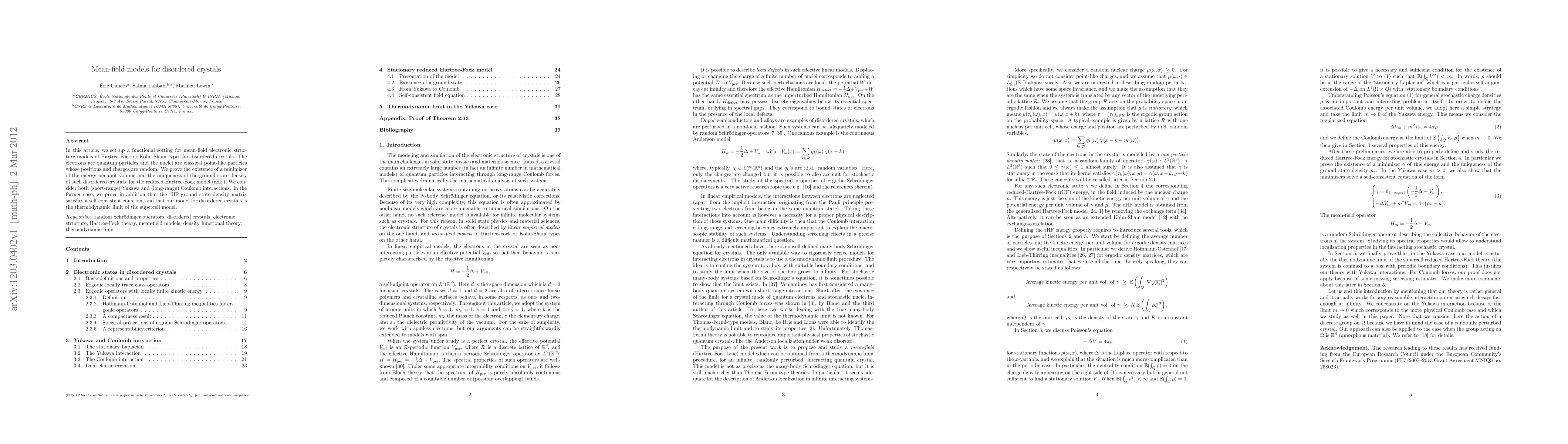 This paper establishes a functional framework for mean-field models of disordered crystals, proving the existence and uniqueness of the ground state density for the reduced Hartree-Fock model, considering both Yukawa and Coulomb interactions. It also demonstrates the self-consistency of the ground state density matrix and the model's equivalence to the thermodynamic limit of the supercell model.