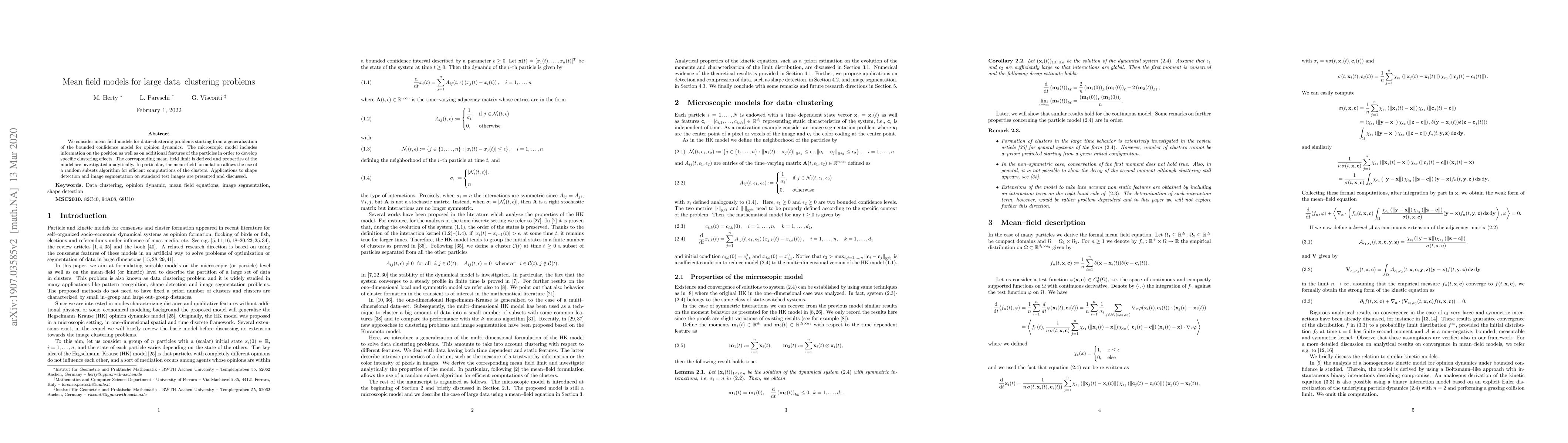 We consider mean-field models for data--clustering problems starting from a generalization of the bounded confidence model for opinion dynamics. The microscopic model includes information on the position as well as on additional features of the particles in order to develop specific clustering effects. The corresponding mean--field limit is derived and properties of the model are investigated analytically. In particular, the mean--field formulation allows the use of a random subsets algorithm for efficient computations of the clusters. Applications to shape detection and image segmentation on standard test images are presented and discussed.