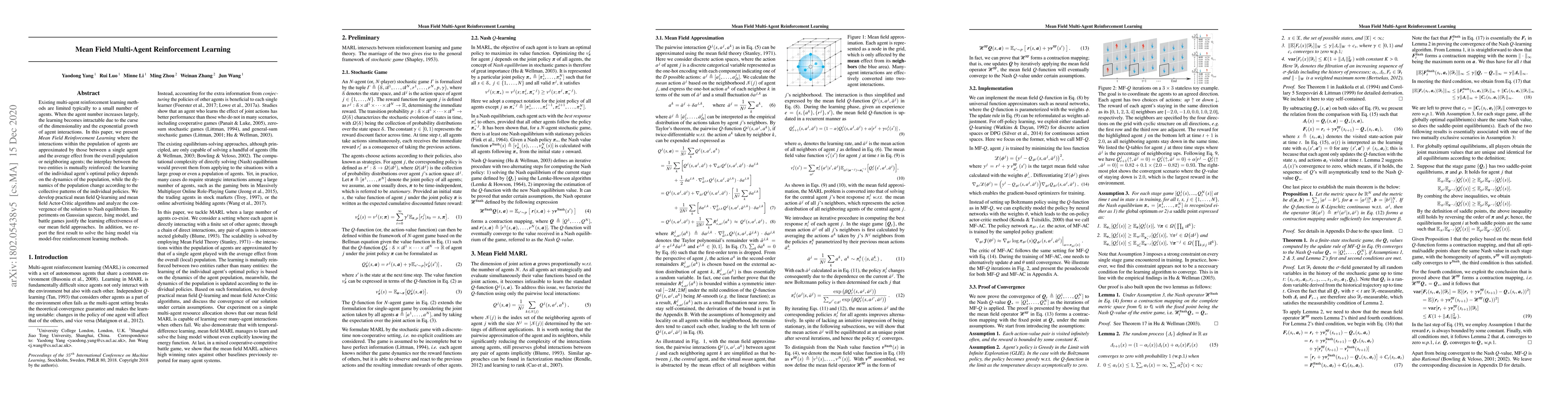 Existing multi-agent reinforcement learning methods are limited typically to a small number of agents. When the agent number increases largely, the learning becomes intractable due to the curse of the dimensionality and the exponential growth of agent interactions. In this paper, we present \emph{Mean Field Reinforcement Learning} where the interactions within the population of agents are approximated by those between a single agent and the average effect from the overall population or neighboring agents; the interplay between the two entities is mutually reinforced: the learning of the individual agent's optimal policy depends on the dynamics of the population, while the dynamics of the population change according to the collective patterns of the individual policies. We develop practical mean field Q-learning and mean field Actor-Critic algorithms and analyze the convergence of the solution to Nash equilibrium. Experiments on Gaussian squeeze, Ising model, and battle games justify the learning effectiveness of our mean field approaches. In addition, we report the first result to solve the Ising model via model-free reinforcement learning methods.