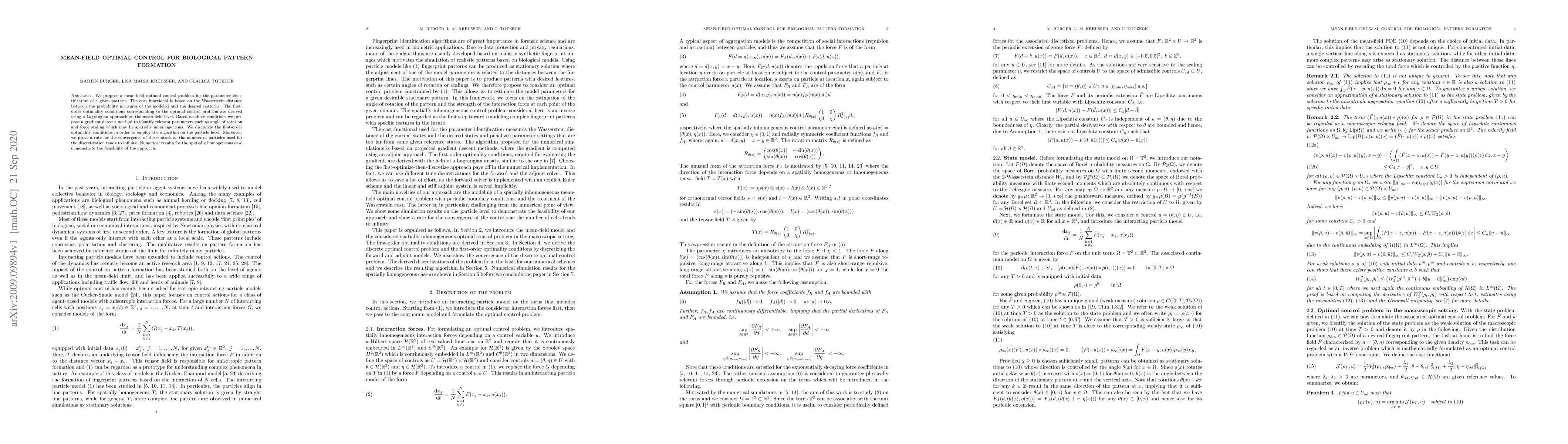 Researchers propose a method for optimizing biological pattern formation using mean-field optimal control, which minimizes the difference between modeled and desired patterns using the Wasserstein distance. The approach has been proven to converge as the number of particles used for discretization increases.
