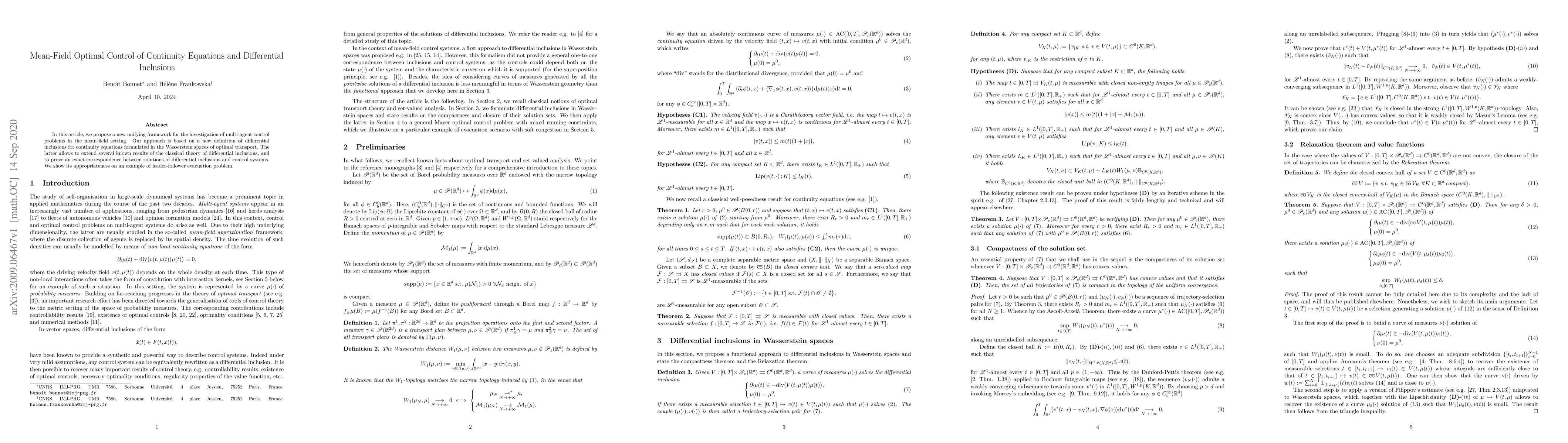 This paper introduces a novel framework for multi-agent control in mean-field settings, utilizing differential inclusions in Wasserstein spaces for continuity equations. It demonstrates an exact correspondence between solutions of differential inclusions and control systems, illustrated through a leader-follower evacuation problem.