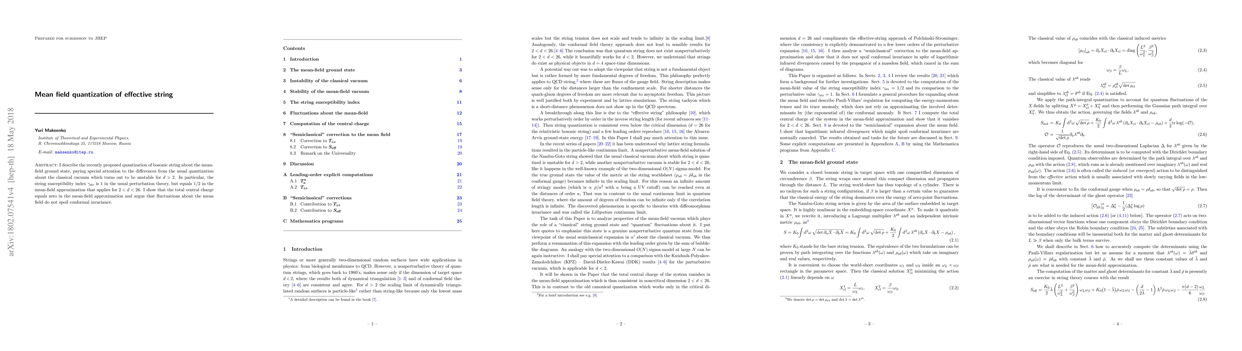This paper quantizes the bosonic string around a mean-field ground state, contrasting it with the usual vacuum quantization, which is unstable for dimensions greater than two. The mean-field approach results in a string susceptibility index of 1/2, and a central charge of zero, preserving conformal invariance despite fluctuations.