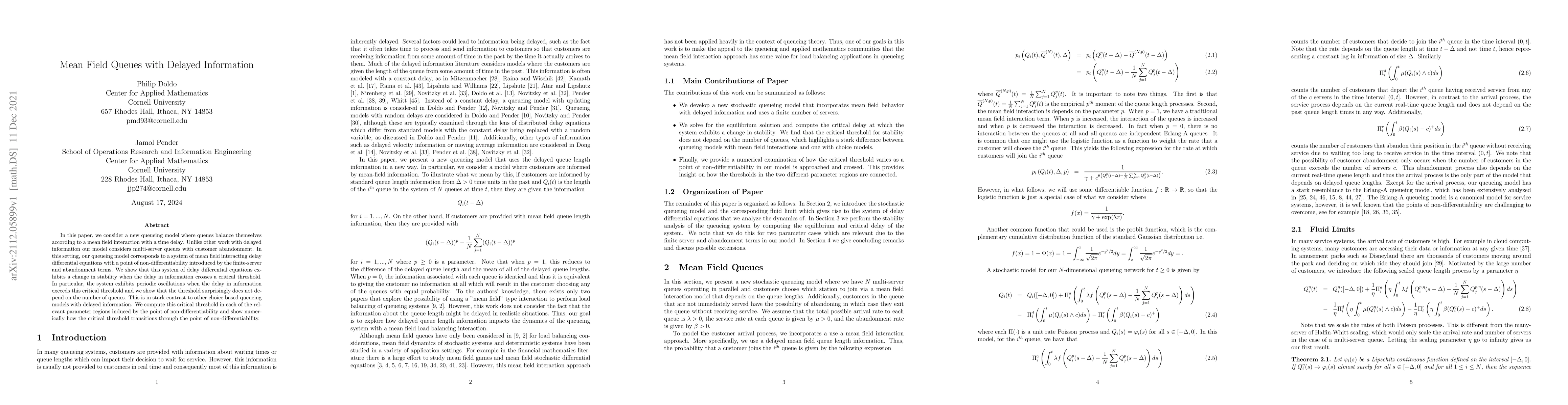 In this paper, we consider a new queueing model where queues balance themselves according to a mean field interaction with a time delay. Unlike other work with delayed information our model considers multi-server queues with customer abandonment. In this setting, our queueing model corresponds to a system of mean field interacting delay differential equations with a point of non-differentiability introduced by the finite-server and abandonment terms. We show that this system of delay differential equations exhibits a change in stability when the delay in information crosses a critical threshold. In particular, the system exhibits periodic oscillations when the delay in information exceeds this critical threshold and we show that the threshold surprisingly does not depend on the number of queues. This is in stark contrast to other choice based queueing models with delayed information. We compute this critical threshold in each of the relevant parameter regions induced by the point of non-differentiability and show numerically how the critical threshold transitions through the point of non-differentiability.