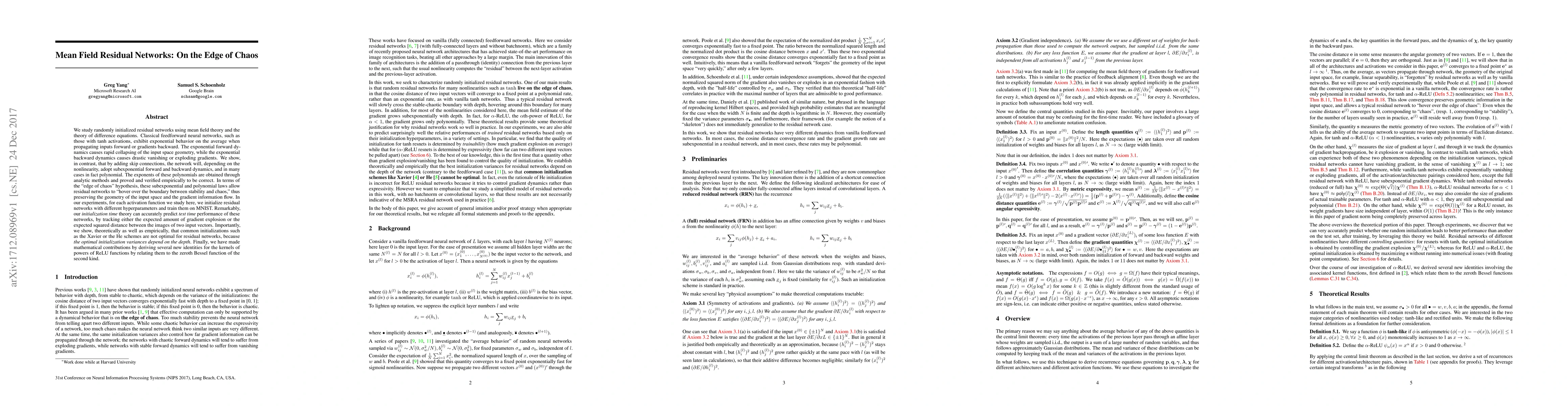 We study randomly initialized residual networks using mean field theory and the theory of difference equations. Classical feedforward neural networks, such as those with tanh activations, exhibit exponential behavior on the average when propagating inputs forward or gradients backward. The exponential forward dynamics causes rapid collapsing of the input space geometry, while the exponential backward dynamics causes drastic vanishing or exploding gradients. We show, in contrast, that by adding skip connections, the network will, depending on the nonlinearity, adopt subexponential forward and backward dynamics, and in many cases in fact polynomial. The exponents of these polynomials are obtained through analytic methods and proved and verified empirically to be correct. In terms of the "edge of chaos" hypothesis, these subexponential and polynomial laws allow residual networks to "hover over the boundary between stability and chaos," thus preserving the geometry of the input space and the gradient information flow. In our experiments, for each activation function we study here, we initialize residual networks with different hyperparameters and train them on MNIST. Remarkably, our initialization time theory can accurately predict test time performance of these networks, by tracking either the expected amount of gradient explosion or the expected squared distance between the images of two input vectors. Importantly, we show, theoretically as well as empirically, that common initializations such as the Xavier or the He schemes are not optimal for residual networks, because the optimal initialization variances depend on the depth. Finally, we have made mathematical contributions by deriving several new identities for the kernels of powers of ReLU functions by relating them to the zeroth Bessel function of the second kind.