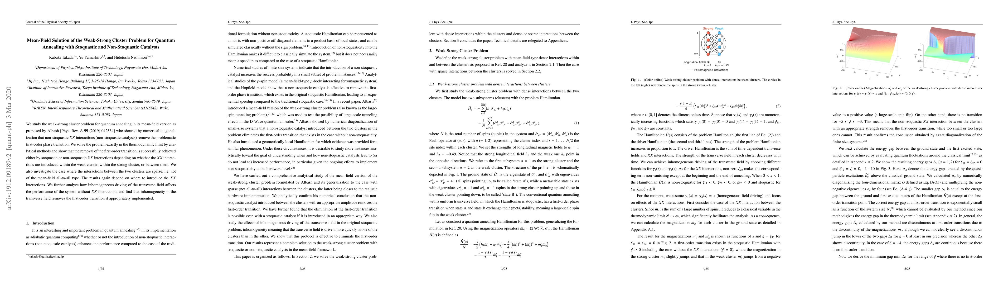 We study the weak-strong cluster problem for quantum annealing in its mean-field version as proposed by Albash [Phys. Rev. A 99 (2019) 042334] who showed by numerical diagonalization that non-stoquastic $XX$ interactions (non-stoquastic catalysts) remove the problematic first-order phase transition. We solve the problem exactly in the thermodynamic limit by analytical methods and show that the removal of the first-order transition is successfully achieved either by stoquastic or non-stoquastic $XX$ interactions depending on whether the $XX$ interactions are introduced within the weak cluster, within the strong cluster, or between them. We also investigate the case where the interactions between the two clusters are sparse, i.e. not of the mean-field all-to-all type. The results again depend on where to introduce the $XX$ interactions. We further analyze how inhomogeneous driving of the transverse field affects the performance of the system without $XX$ interactions and find that inhomogeneity in the transverse field removes the first-order transition if appropriately implemented.
