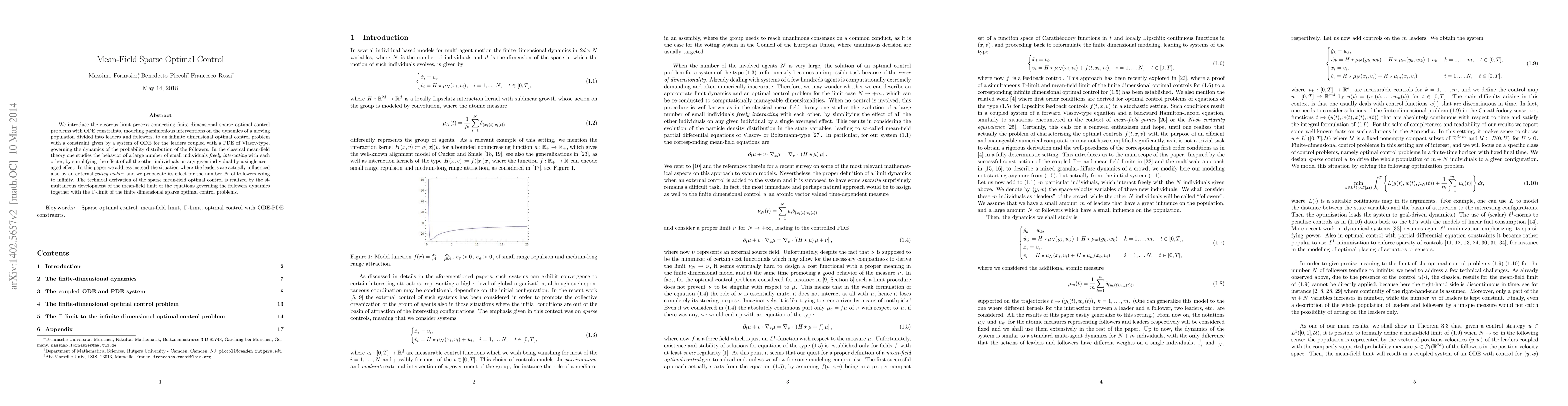We introduce the rigorous limit process connecting finite dimensional sparse optimal control problems with ODE constraints, modeling parsimonious interventions on the dynamics of a moving population divided into leaders and followers, to an infinite dimensional optimal control problem with a constraint given by a system of ODE for the leaders coupled with a PDE of Vlasov-type, governing the dynamics of the probability distribution of the followers. In the classical mean-field theory one studies the behavior of a large number of small individuals freely interacting with each other, by simplifying the effect of all the other individuals on any given individual by a single averaged effect. In this paper we address instead the situation where the leaders are actually influenced also by an external policy maker, and we propagate its effect for the number $N$ of followers going to infinity. The technical derivation of the sparse mean-field optimal control is realized by the simultaneous development of the mean-field limit of the equations governing the followers dynamics together with the $\Gamma$-limit of the finite dimensional sparse optimal control problems.