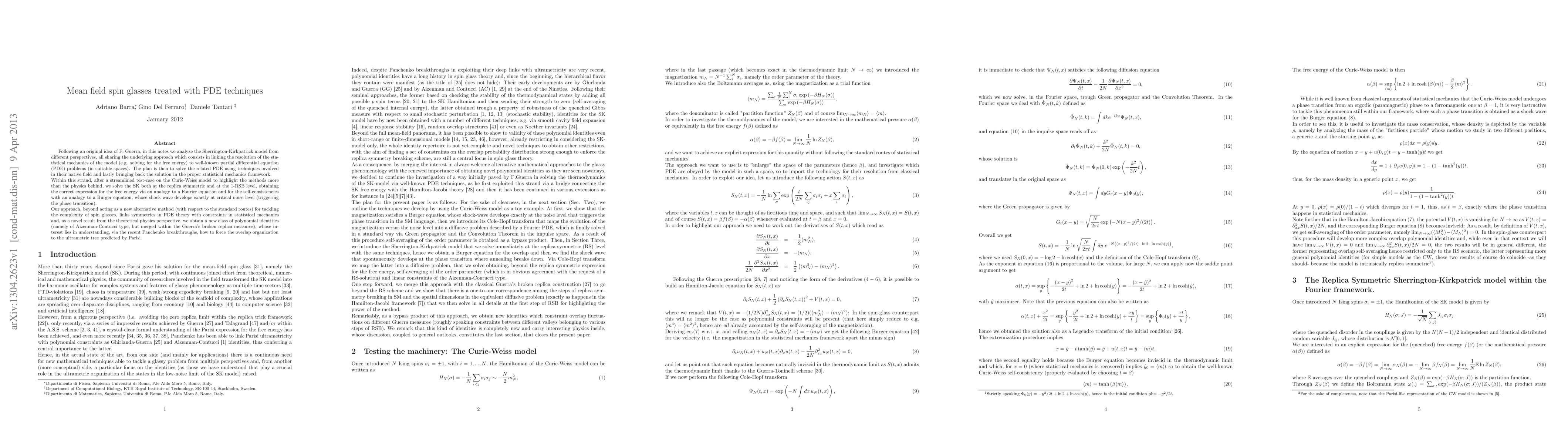 Following an original idea of F. Guerra, in this notes we analyze the Sherrington-Kirkpatrick model from different perspectives, all sharing the underlying approach which consists in linking the resolution of the statistical mechanics of the model (e.g. solving for the free energy) to well-known partial differential equation (PDE) problems (in suitable spaces). The plan is then to solve the related PDE using techniques involved in their native field and lastly bringing back the solution in the proper statistical mechanics framework. Within this strand, after a streamlined test-case on the Curie-Weiss model to highlight the methods more than the physics behind, we solve the SK both at the replica symmetric and at the 1-RSB level, obtaining the correct expression for the free energy via an analogy to a Fourier equation and for the self-consistencies with an analogy to a Burger equation, whose shock wave develops exactly at critical noise level (triggering the phase transition). Our approach, beyond acting as a new alternative method (with respect to the standard routes) for tackling the complexity of spin glasses, links symmetries in PDE theory with constraints in statistical mechanics and, as a novel result from the theoretical physics perspective, we obtain a new class of polynomial identities (namely of Aizenman-Contucci type but merged within the Guerra's broken replica measures), whose interest lies in understanding, via the recent Panchenko breakthroughs, how to force the overlap organization to the ultrametric tree predicted by Parisi.