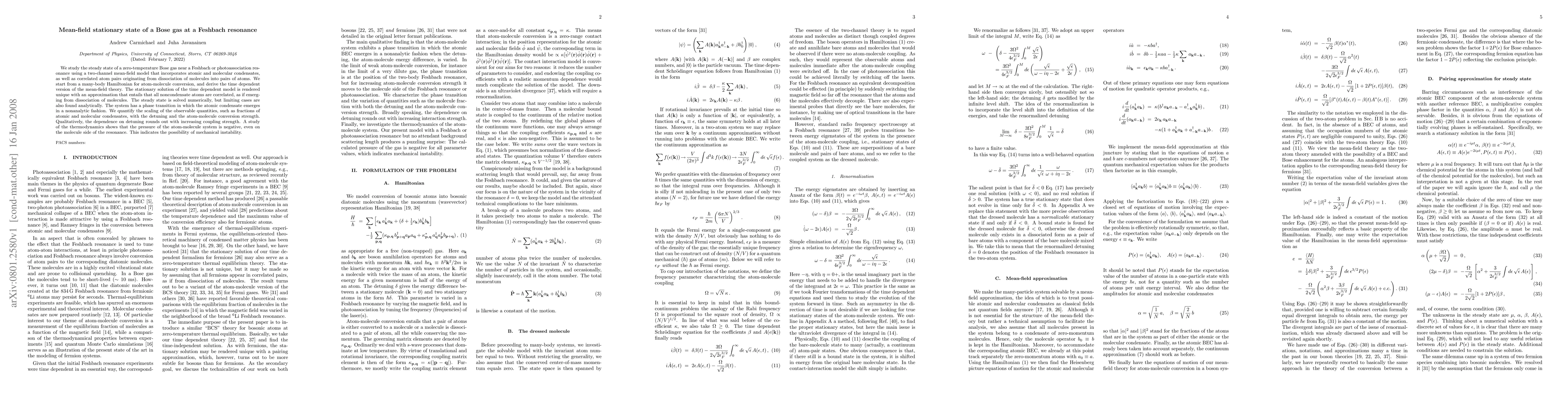 We study the steady state of a zero-temperature Bose gas near a Feshbach or photoassociation resonance using a two-channel mean-field model that incorporates atomic and molecular condensates, as well as correlated atom pairs originating from dissociation of molecules into pairs of atoms. We start from a many-body Hamiltonian for atom-molecule conversion, and derive the time dependent version of the mean-field theory. The stationary solution of the time dependent model is rendered unique with an approximation that entails that all noncondensate atoms are correlated, as if emerging from dissociation of molecules. The steady state is solved numerically, but limiting cases are also found analytically. The system has a phase transition in which the atomic condensate emerges in a nonanalytic fashion. We quantify the scaling of the observable quantities, such as fractions of atomic and molecular condensates, with the detuning and the atom-molecule conversion strength. Qualitatively, the dependence on detuning rounds out with increasing coupling strength. A study of the thermodynamics shows that the pressure of the atom-molecule system is negative, even on the molecule side of the resonance. This indicates the possibility of mechanical instability.