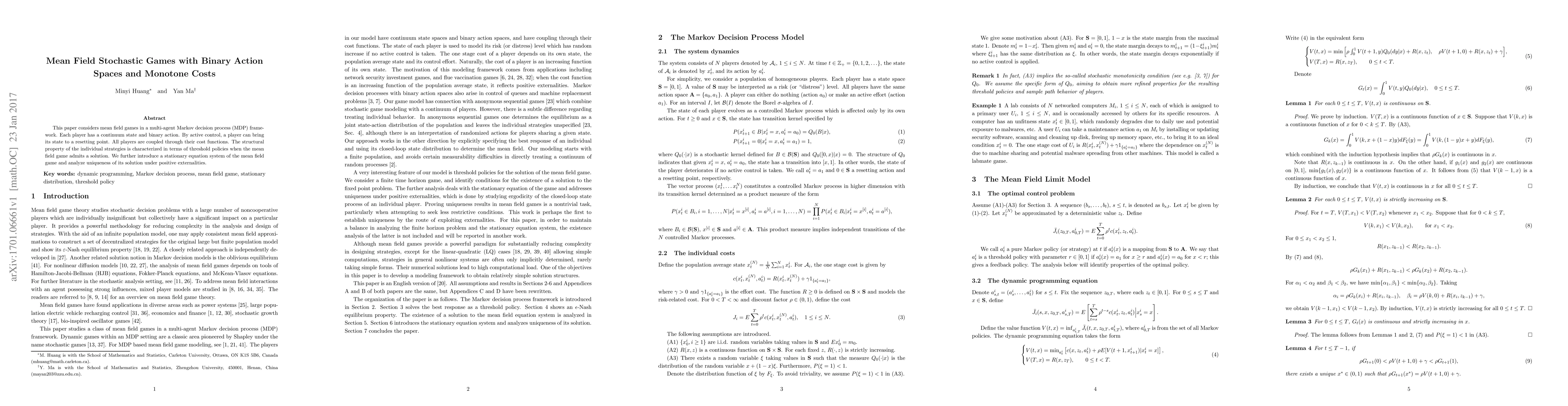 This research identifies structural properties of individual strategies in mean field games with binary actions and monotone costs. It introduces a stationary equation system to analyze the uniqueness of solutions under positive externalities in a multi-agent Markov decision process framework.