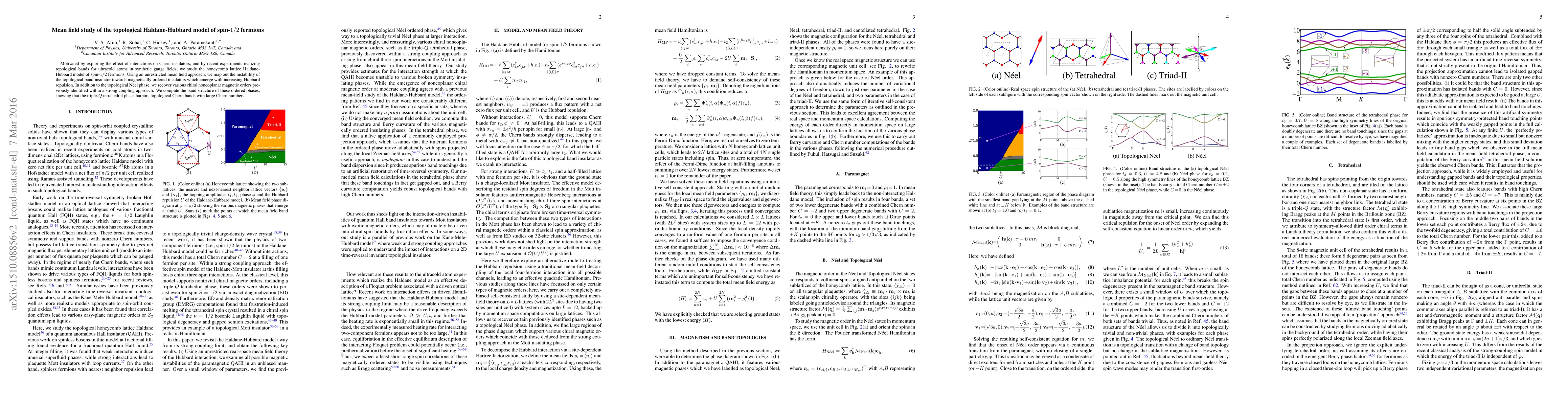 This paper investigates the Haldane-Hubbard model on a honeycomb lattice for spin-$1/2$ fermions, revealing how interactions destabilize the topological band insulator, leading to various magnetically ordered phases, including topological N\'eel and chiral noncoplanar phases, with the triple-$Q$ tetrahedral phase exhibiting significant topological Chern bands.