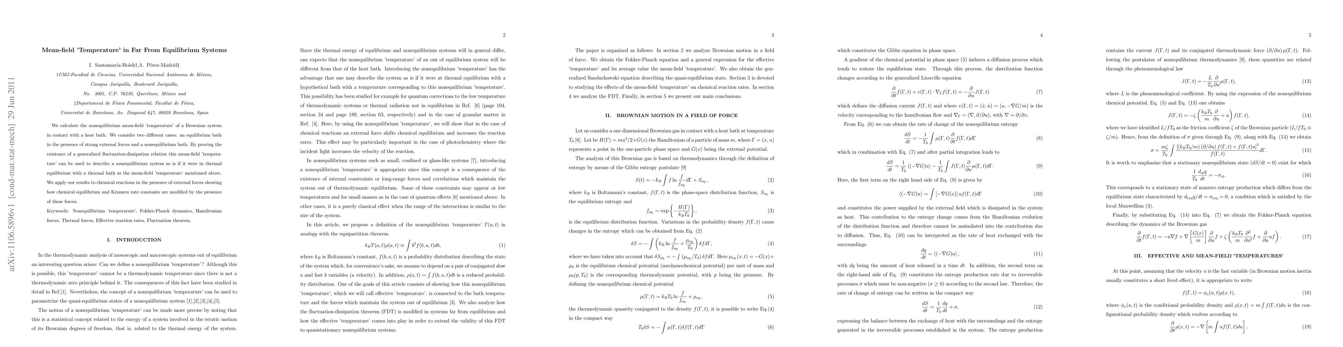 We calculate the nonequilibrium mean-field 'temperature' of a Brownian system in contact with a heat bath. We consider two different cases: an equilibrium bath in the presence of strong external forces and a nonequilibrium bath. By proving the existence of a generalized fluctuation-dissipation relation this mean-field 'temperature' can be used to describe a nonequilibrium system as is if it were in thermal equilibrium with a thermal bath at the mean-field 'temperature' mentioned above. We apply our results to chemical reactions in the presence of external forces showing how chemical equilibrium and Kramers rate constants are modified by the presence of these forces.