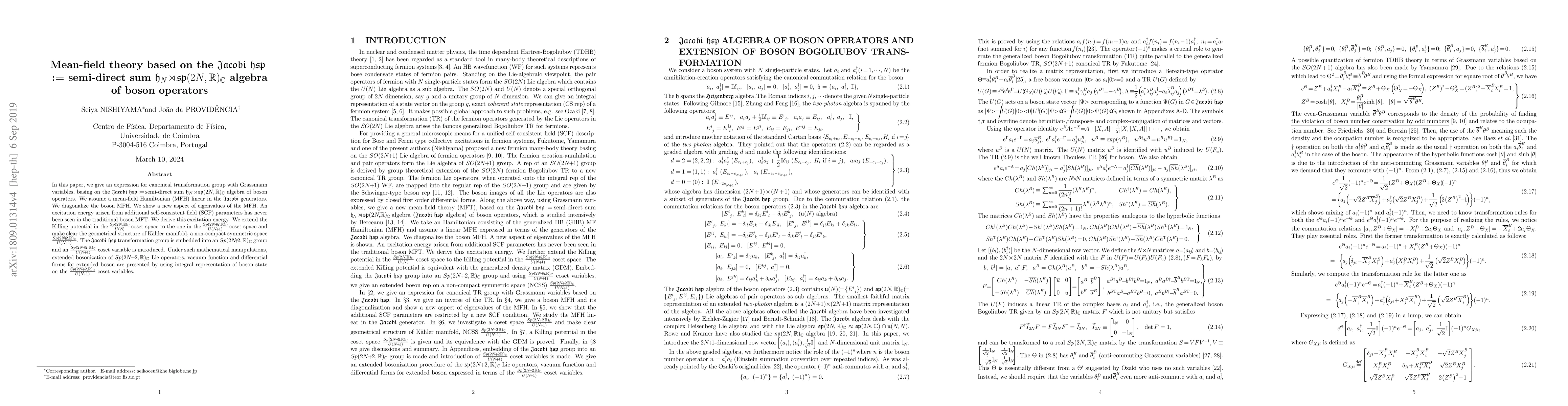 In this paper, we give an expression for canonical transformation group with Grassmann variables, basing on the \mathfrak{Jacobi~hsp} \!:= semi-direct sum \mathfrak{h}_{N} \rtimes \mathfrak{sp}(2N,\mathbb{R})_\mathbb{C} algebra of boson operators. We assume a mean-field Hamiltonian (MFH) linear in the \mathfrak{Jacobi} generators. We diagonalize the boson MFH. We show a new aspect of eigenvalues of the MFH. An excitation energy arisen from additional self-consistent field (SCF) parameters has never been seen in the traditional boson MFT. We derive this excitation energy. We extend the Killing potential in the \frac{Sp(2N,\mathbb{R})_\mathbb{C}}{U(N)} coset space to the one in the \frac{Sp(2N+2,\mathbb{R})_\mathbb{C}}{U(N+1)} coset space and make clear the geometrical structure of K\"{a}hler manifold, a non-compact symmetric space \frac{Sp(2N+2,\mathbb{R})_\mathbb{C}}{U(N+1)}. The \mathfrak{Jacobi~hsp} transformation group is embedded into an Sp(2N+2,\mathbb{R})_\mathbb{C} group and an \frac{Sp(2N+2,\mathbb{R})_\mathbb{C}}{U(N+1)} coset variable is introduced. Under such mathematical manipulations, extended bosonization of Sp(2N+2,\mathbb{R})_\mathbb{C} Lie operators, vacuum function and differential forms for extended boson are presented by using integral representation of boson state on the \frac{Sp(2N+2,\mathbb{R})_\mathbb{C}}{U(N+1)} coset variables.