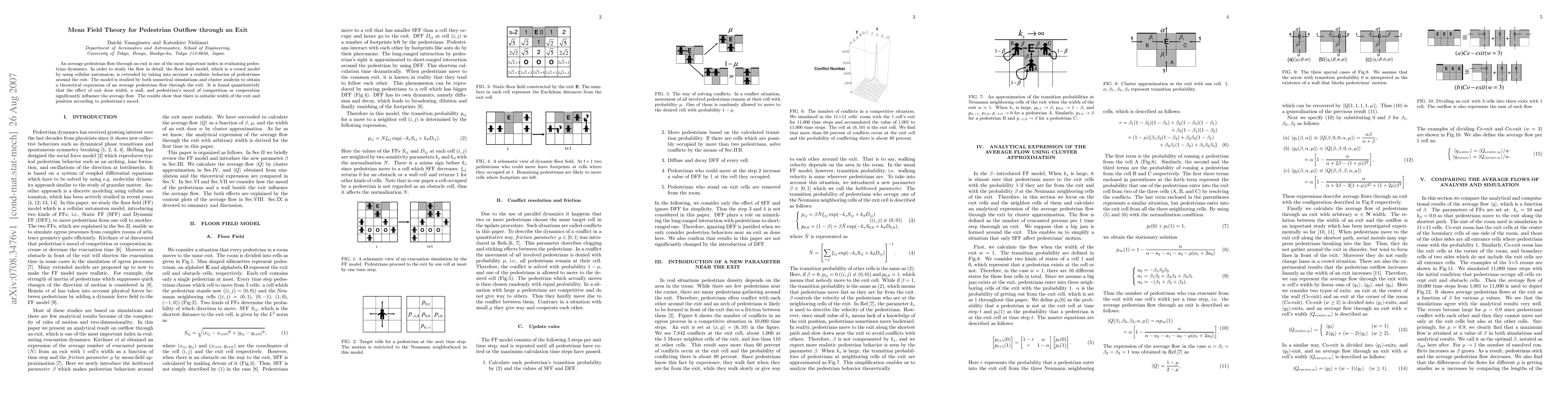 An average pedestrian flow through an exit is one of the most important index in evaluating pedestrian dynamics. In order to study the flow in detail, the floor field model, which is a crowd model by using cellular automaton, is extended by taking into account a realistic behavior of pedestrians around the exit. The model is studied by both numerical simulations and cluster analysis to obtain a theoretical expression of an average pedestrian flow through the exit. It is found quantitatively that the effect of exit door width, a wall, and pedestrian's mood of competition or cooperation significantly influence the average flow. The results show that there is suitable width of the exit and position according to pedestrian's mood.