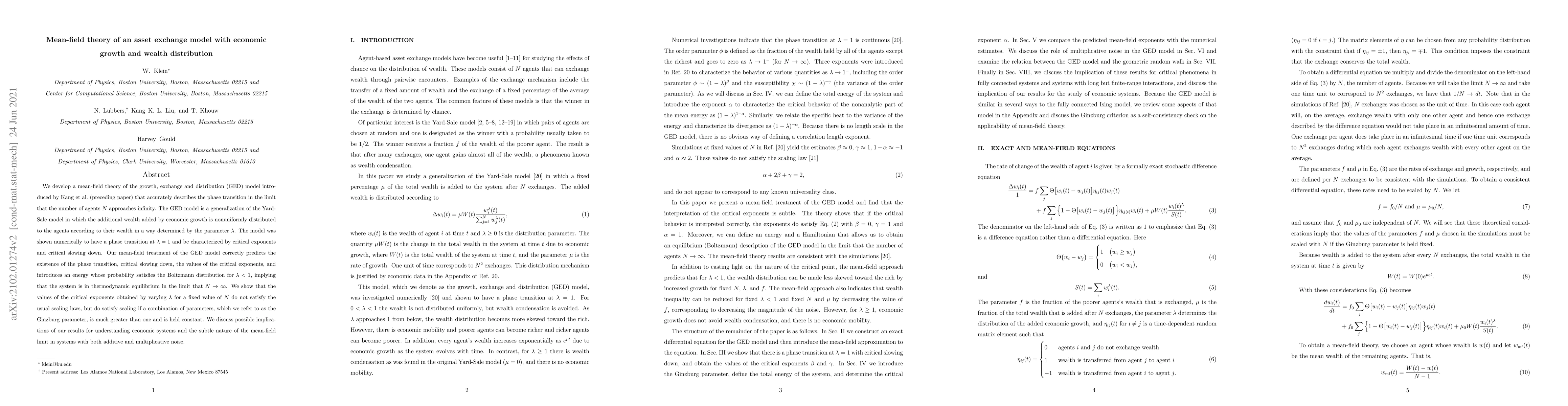 We develop a mean-field theory of the growth, exchange and distribution (GED) model introduced by Kang et al. (preceding paper) that accurately describes the phase transition in the limit that the number of agents $N$ approaches infinity. The GED model is a generalization of the Yard-Sale model in which the additional wealth added by economic growth is nonuniformly distributed to the agents according to their wealth in a way determined by the parameter $\lambda$. The model was shown numerically to have a phase transition at $\lambda=1$ and be characterized by critical exponents and critical slowing down. Our mean-field treatment of the GED model correctly predicts the existence of the phase transition, critical slowing down, the values of the critical exponents, and introduces an energy whose probability satisfies the Boltzmann distribution for $\lambda < 1$, implying that the system is in thermodynamic equilibrium in the limit that $N \to \infty$. We show that the values of the critical exponents obtained by varying $\lambda$ for a fixed value of $N$ do not satisfy the usual scaling laws, but do satisfy scaling if a combination of parameters, which we refer to as the Ginzburg parameter, is much greater than one and is held constant. We discuss possible implications of our results for understanding economic systems and the subtle nature of the mean-field limit in systems with both additive and multiplicative noise.