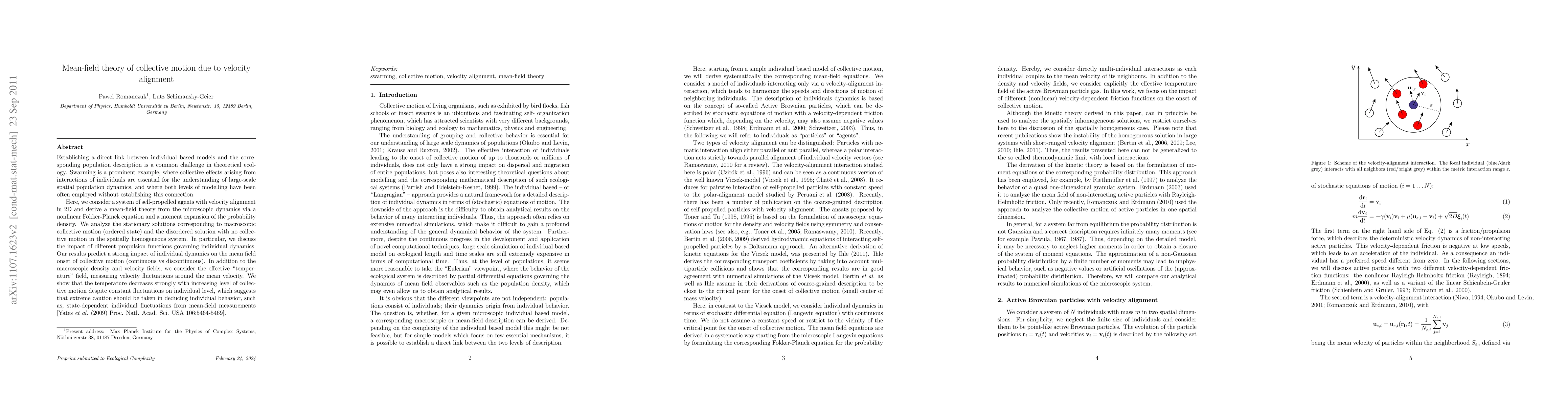 This paper develops a mean-field theory for self-propelled agents with velocity alignment, predicting the onset of collective motion through a nonlinear Fokker-Planck equation. It highlights the influence of individual dynamics on the transition from disordered to ordered states, and notes a decrease in effective temperature with increased collective motion, cautioning against inferring individual behavior from mean-field data.