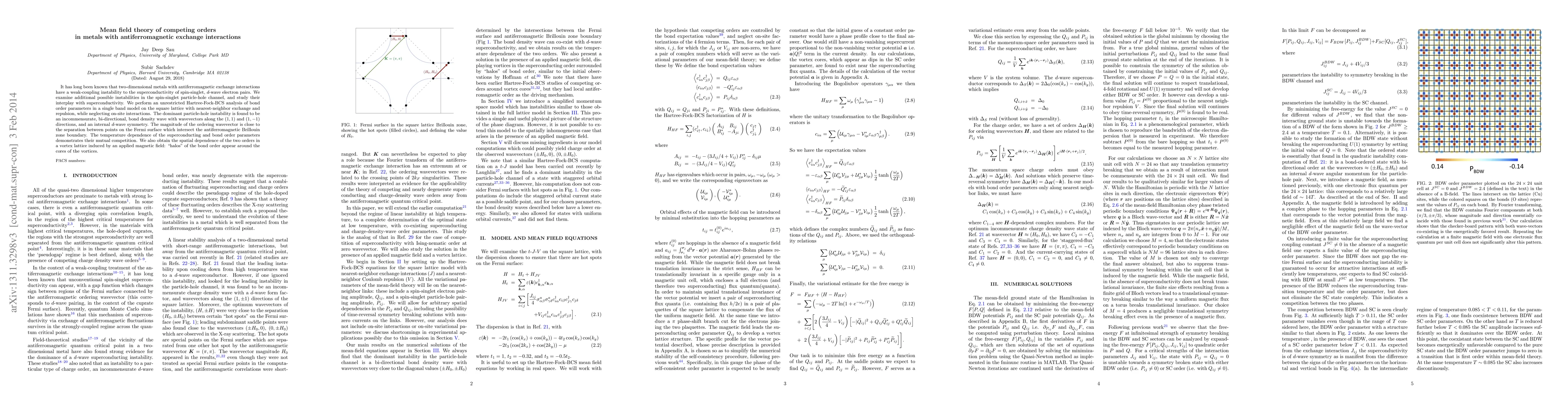 This paper investigates instabilities in two-dimensional metals with antiferromagnetic exchange interactions, finding an incommensurate, bi-directional bond density wave alongside d-wave superconductivity, and demonstrates their mutual competition and spatial interplay in a vortex lattice.