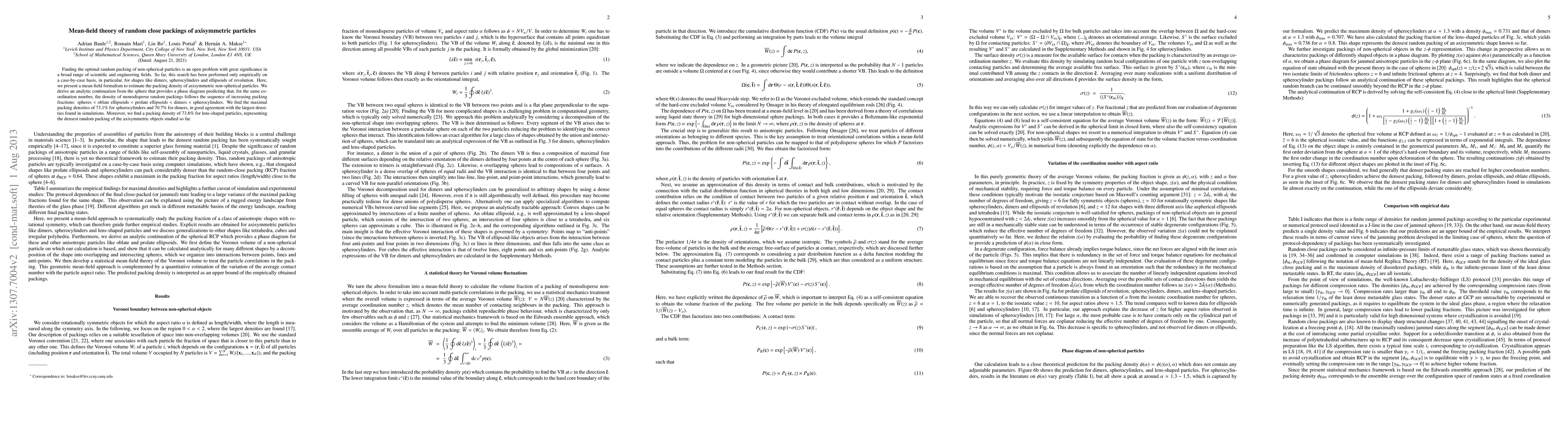 This paper introduces a mean-field theory to estimate the packing density of axisymmetric non-spherical particles, predicting that for the same coordination number, the packing density increases in the sequence: spheres < oblate ellipsoids < prolate ellipsoids < dimers < spherocylinders. The maximal packing densities found are 73.1% for spherocylinders and 70.7% for dimers, with lens-shaped particles achieving the densest random packing at 73.6%.