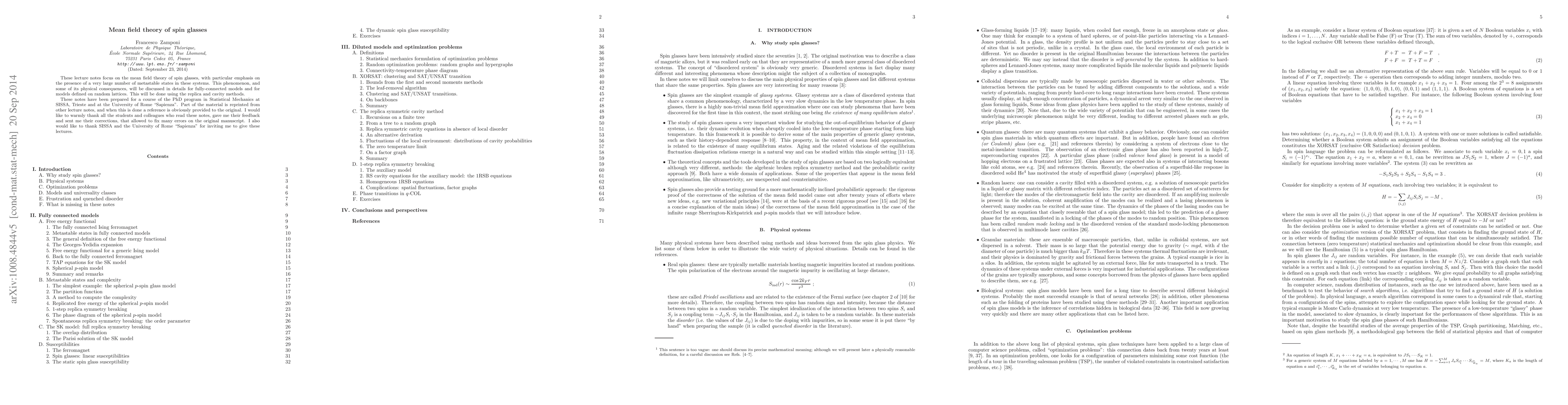 Summary: These lecture notes explore the mean field theory of spin glasses, focusing on the extensive number of metastable states in these systems. The discussion utilizes replica and cavity methods for fully-connected and random lattice models, and is part of a PhD program in Statistical Mechanics at SISSA and the University of Rome.