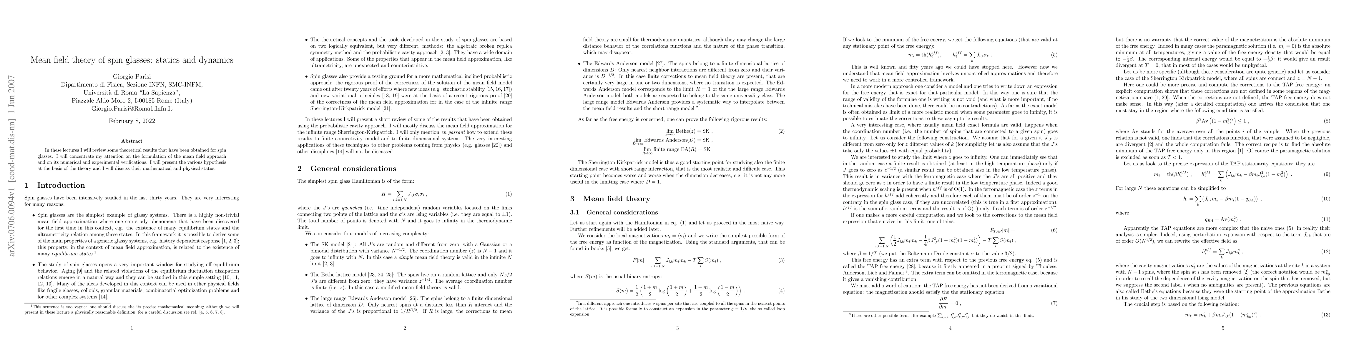 This paper reviews theoretical results on spin glasses, focusing on the mean field approach, its hypotheses, and their mathematical and physical implications, alongside numerical and experimental verifications.