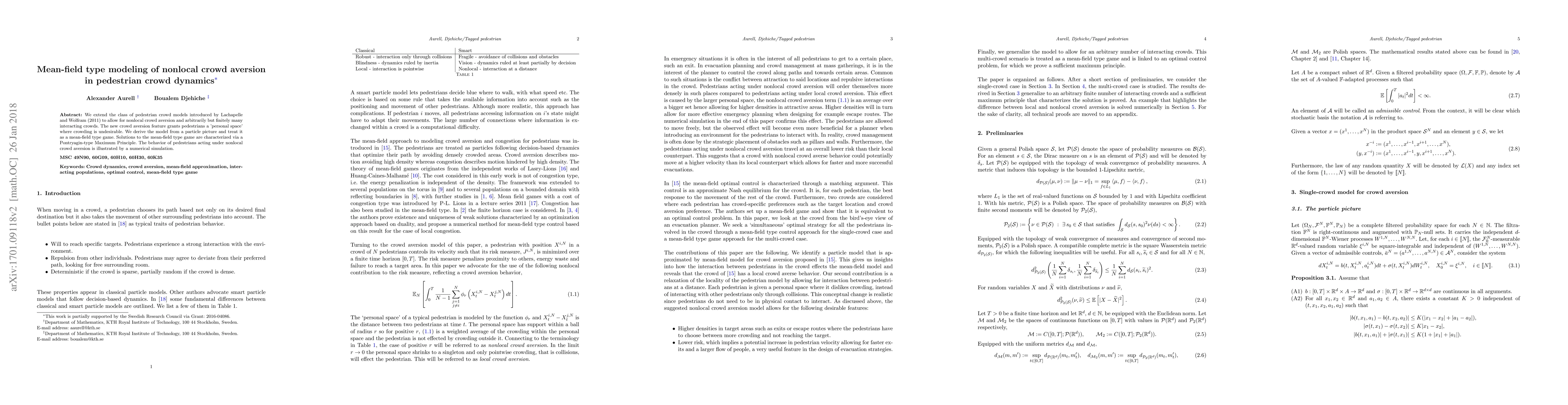 This paper extends pedestrian crowd models to incorporate nonlocal crowd aversion, allowing pedestrians to maintain a "personal space." The model is derived from a particle perspective and analyzed using a mean-field game framework, with solutions characterized by a Pontryagin-type Maximum Principle, and validated through numerical simulations.
