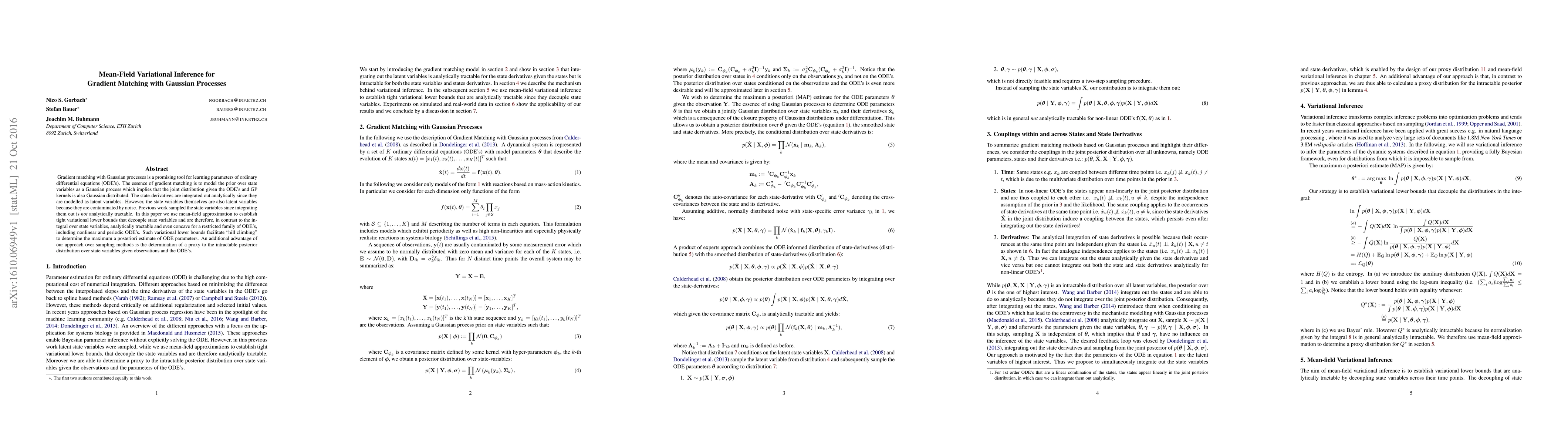 Researchers developed a method for learning parameters of ODEs using gradient matching with Gaussian processes, providing a more efficient approach than sampling methods, and enabling the estimation of a proxy to the intractable posterior distribution over state variables.