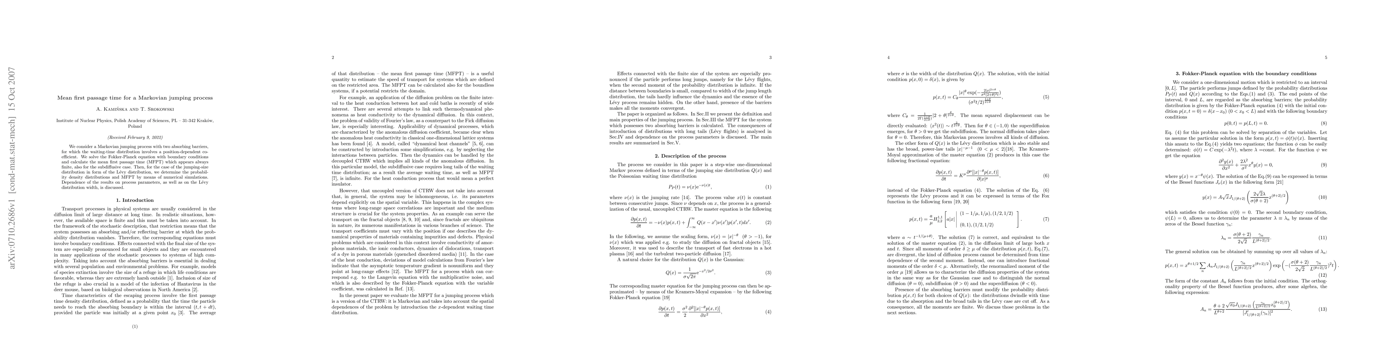 This paper investigates a Markovian jumping process with two absorbing barriers and a position-dependent coefficient, solving the Fokker-Planck equation to find a finite mean first passage time (MFPT) even in subdiffusive cases. It also numerically analyzes the process with a L\'evy distribution for jumping sizes, discussing parameter dependencies.