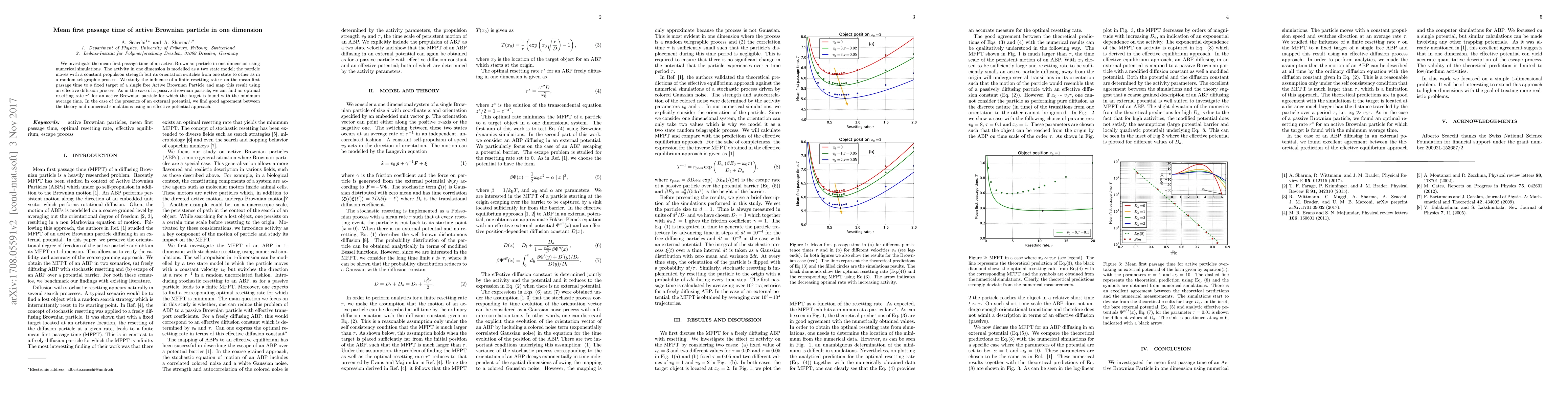 Numerical simulations were used to investigate the mean first passage time of an Active Brownian Particle in one dimension.