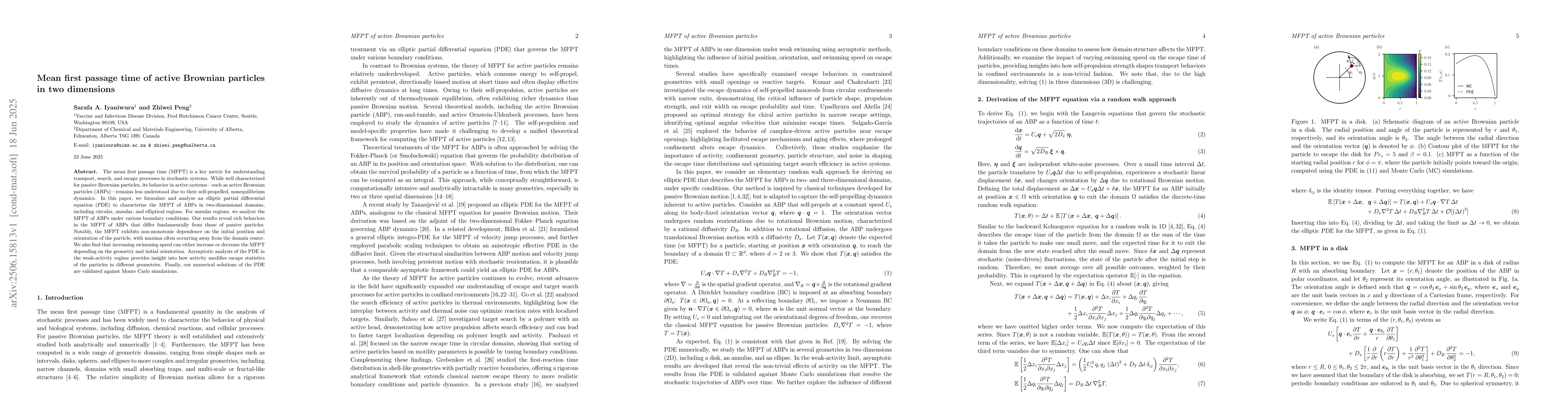 This research derives a PDE to analyze the mean first passage time (MFPT) of active Brownian particles (ABPs) in 2D domains, revealing distinct behaviors from passive particles. MFPT shows non-monotonic dependence on initial position and orientation, with activity altering escape statistics in varying geometries.