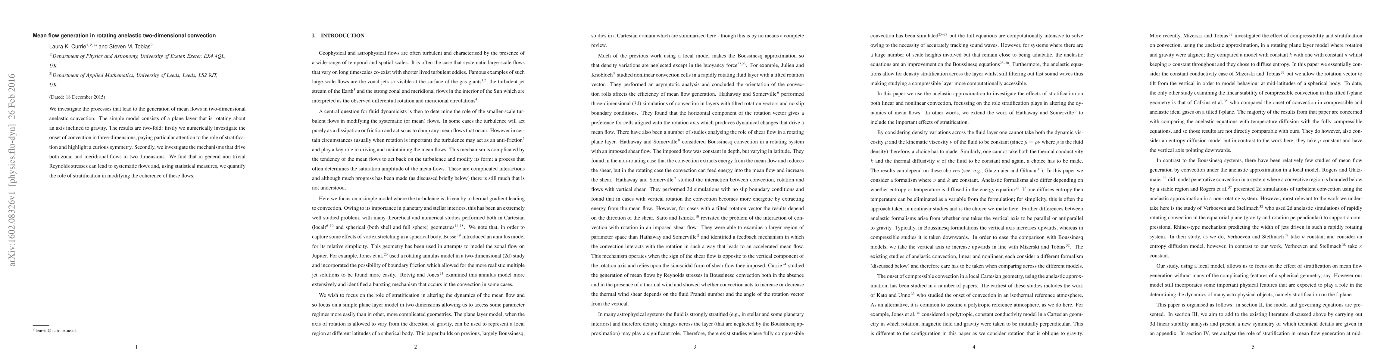 We investigate the processes that lead to the generation of mean flows in two-dimensional anelastic convection. The simple model consists of a plane layer that is rotating about an axis inclined to gravity. The results are two-fold: firstly we numerically investigate the onset of convection in three-dimensions, paying particular attention to the role of stratification and highlight a curious symmetry. Secondly, we investigate the mechanisms that drive both zonal and meridional flows in two dimensions. We find that, in general, non-trivial Reynolds stresses can lead to systematic flows and, using statistical measures, we quantify the role of stratification in modifying the coherence of these flows.