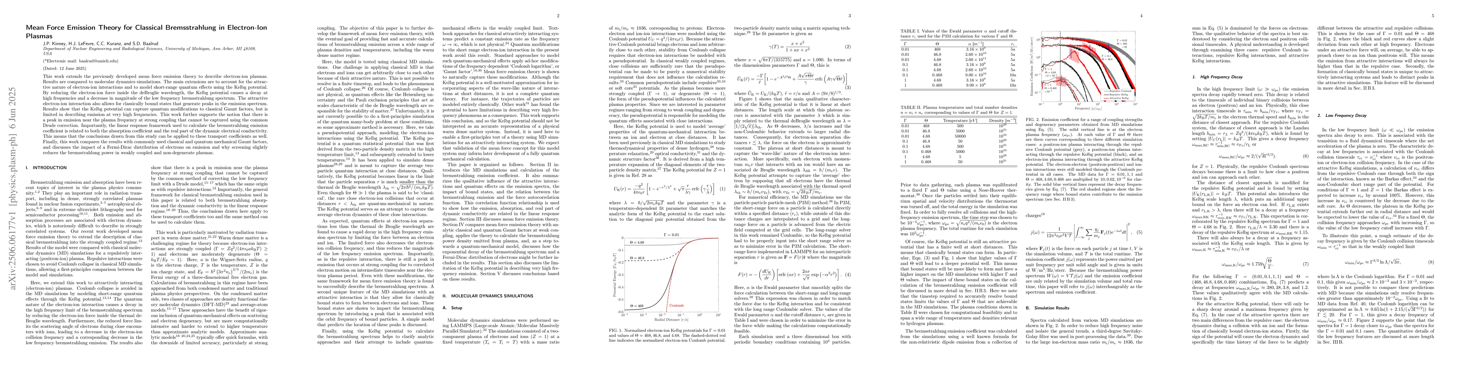 This work extends the previously developed mean force emission theory to describe electron-ion plasmas. Results are compared to molecular dynamics simulations. The main extensions are to account for the attractive nature of electron-ion interactions and to model short-range quantum effects using the Kelbg potential. By reducing the electron-ion force inside the deBroglie wavelength, the Kelbg potential causes a decay at high frequencies and a decrease in magnitude of the low frequency bremsstrahlung spectrum. The attractive electron-ion interaction also allows for classically bound states that show up as peaks in the emission spectrum. Results show that the Kelbg potential can capture quantum modifications to classical Gaunt factors, but is limited in describing emission at very high frequencies. This work further supports the notion that there is a peak in emission near the plasma frequency at strong coupling that cannot be captured using the common Drude correction. Importantly, the linear response framework used to calculate the bremsstrahlung emission coefficient is related to both the absorption coefficient and the real part of the dynamic electrical conductivity. This means that the conclusions drawn from this study can be applied to these transport coefficients as well. Finally, this work compares the results with commonly used classical and quantum mechanical Gaunt factors, and discusses the impact of a Fermi-Dirac distribution of electrons on emission and why screening slightly reduces the bremsstrahlung power in weakly coupled and non-degenerate plasmas.