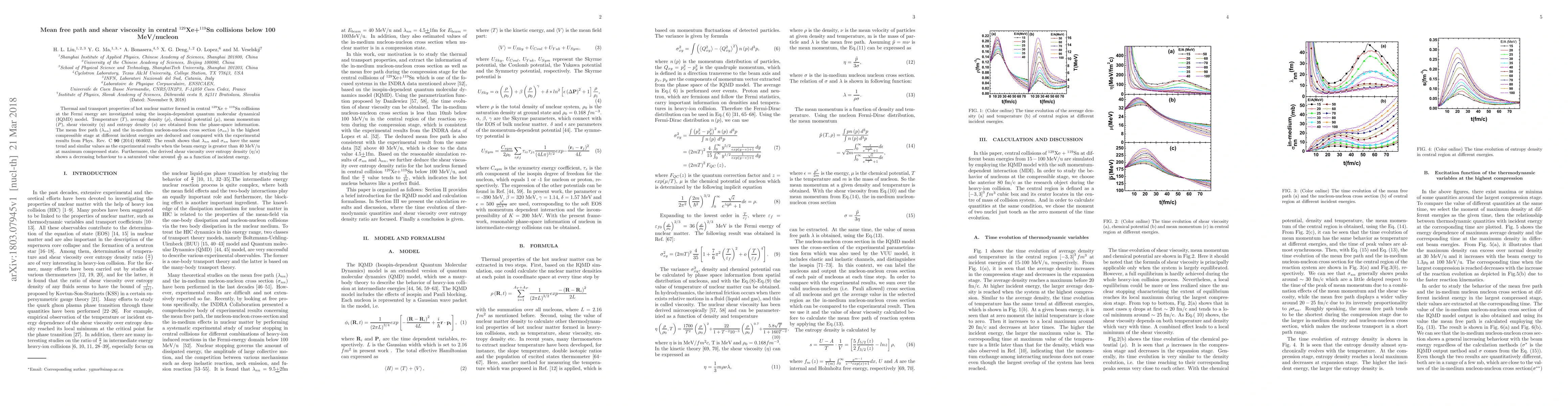 Researchers used the IQMD model to study the properties of hot nuclear matter formed in collisions between Xe and Sn nuclei at high energies. They found that the mean free path and shear viscosity decrease as energy increases, similar to experimental results.