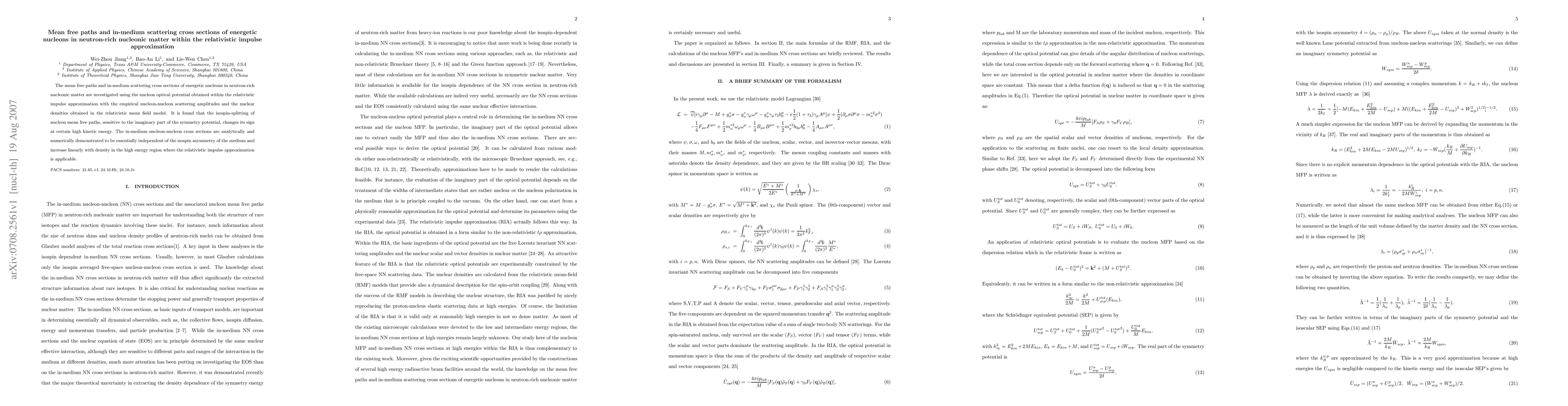 This paper investigates the mean free paths and in-medium scattering cross sections of energetic nucleons in neutron-rich nucleonic matter using the relativistic impulse approximation. It finds that the isospin-splitting of nucleon mean free paths changes sign at high kinetic energy, while the in-medium nucleon-nucleon cross sections are independent of isospin asymmetry and increase linearly with density at high energy.