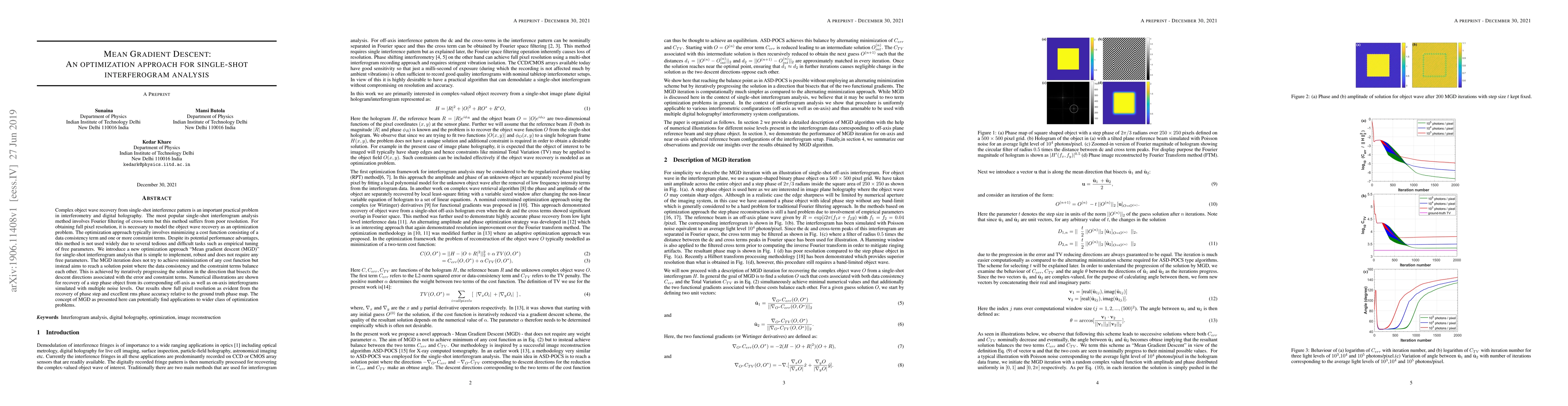 The paper introduces Mean Gradient Descent (MGD), a novel optimization approach for single-shot interferogram analysis, which offers full pixel resolution without requiring free parameters. MGD iteratively balances data consistency and constraint terms by bisecting descent directions, demonstrating effective recovery of complex object waves from interferograms.