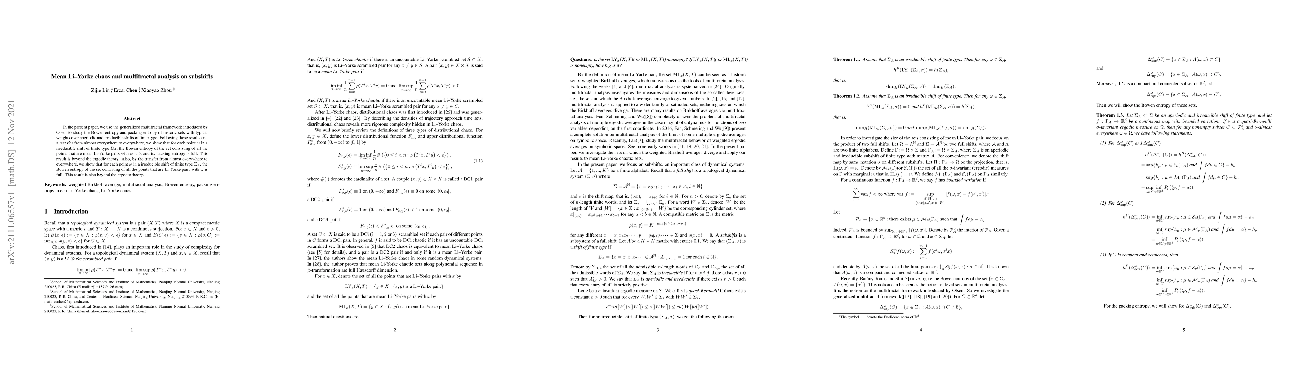 In the present paper, we use the generalized multifractal framework introduced by Olsen to study the Bowen entropy and packing entropy of historic sets with typical weights over aperiodic and irreducible shifts of finite type. Following those results and a transfer from almost everywhere to everywhere, we show that for each point $\omega$ in a irreducible shift of finite type $\Sigma_A$, the Bowen entropy of the set consisting of all the points that are mean Li-Yorke pairs with $\omega$ is $0$, and its packing entropy is full. This result is beyond the ergodic theory. Also, by the transfer from almost everywhere to everywhere, we show that for each point $\omega$ in a irreducible shift of finite type $\Sigma_A$, the Bowen entropy of the set consisting of all the points that are Li-Yorke pairs with $\omega$ is full. This result is also beyond the ergodic theory.