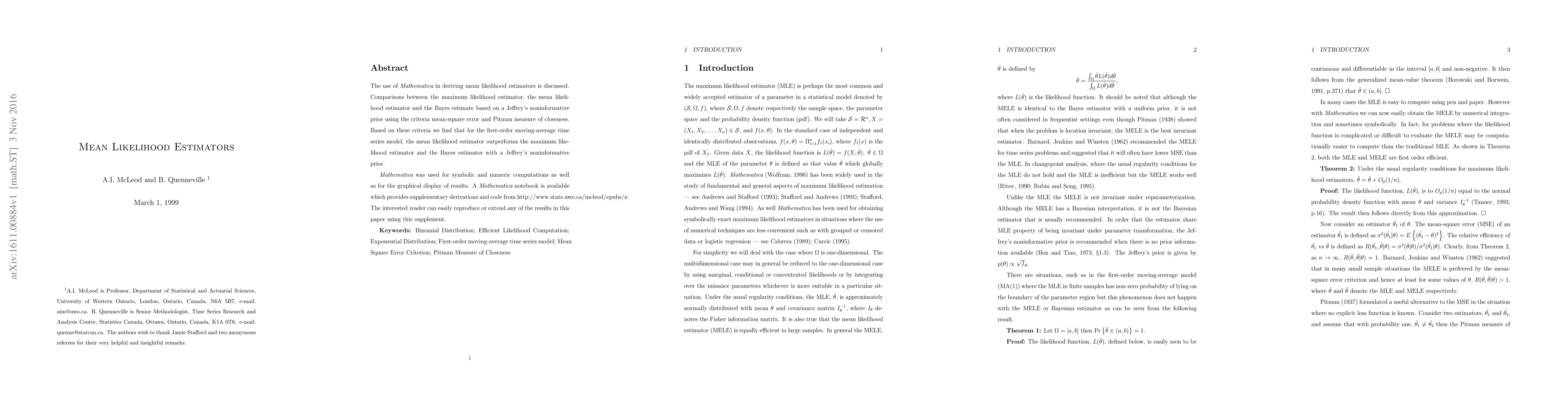 The use of {\it Mathematica} in deriving mean likelihood estimators is discussed. Comparisons between the maximum likelihood estimator, the mean likelihood estimator and the Bayes estimate based on a Jeffrey's noninformative prior using the criteria mean-square error and Pitman measure of closeness. Based on these criteria we find that for the first-order moving-average time series model, the mean likelihood estimator outperforms the maximum likelihood estimator and the Bayes estimator with a Jeffrey's noninformative prior. {\it Mathematica} was used for symbolic and numeric computations as well as for the graphical display of results. A {\it Mathematica} notebook is available which provides supplementary derivations and code from http://www.stats.uwo.ca/mcleod/epubs/mele The interested reader can easily reproduce or extend any of the results in this paper using this supplement.