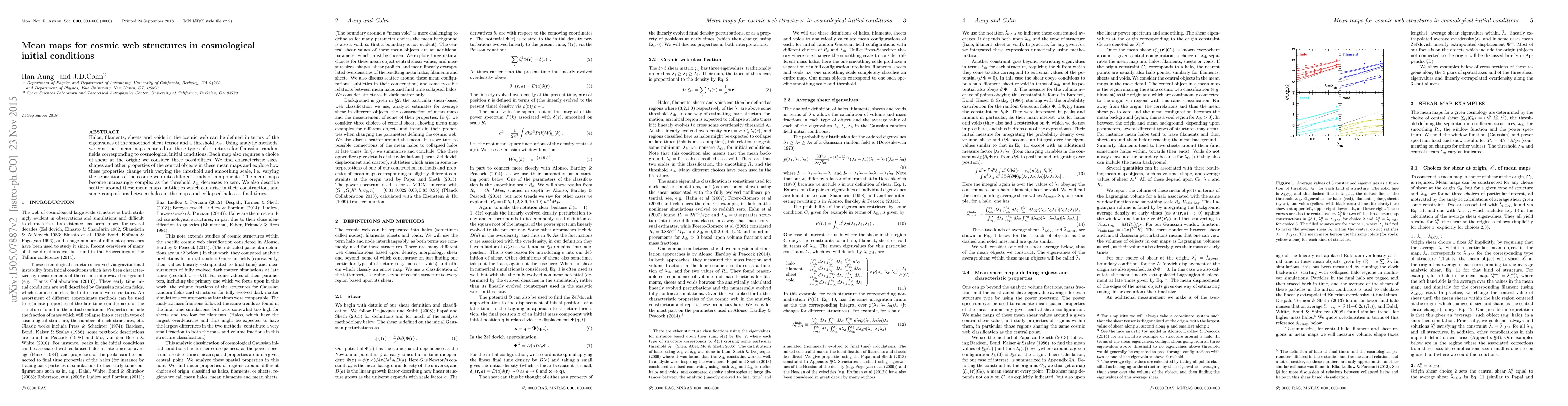 Halos, filaments, sheets and voids in the cosmic web can be defined in terms of the eigenvalues of the smoothed shear tensor and a threshold $\lambda_{\rm th}$. Using analytic methods, we construct mean maps centered on these types of structures for Gaussian random fields corresponding to cosmological initial conditions. Each map also requires a choice of shear at the origin; we consider three possibilities. We find characteristic sizes, shapes and other properties of the central objects in these mean maps and explore how these properties change with varying the threshold and smoothing scale, i.e. varying the separation of the cosmic web into different kinds of components. The mean maps become increasingly complex as the threshold $\lambda_{\rm th}$ decreases to zero. We also describe scatter around these mean maps, subtleties which can arise in their construction, and some comparisons between halos in the maps and collapsed halos at final times.